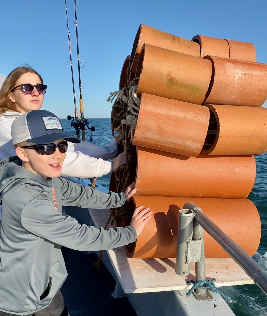 The kids aboard had a big block drop today. The pipe unit was among the largest we’ve ever dropped from my boat. All terracotta from York Building Products; what I wouldn’t give for an endless supply of that materiel. The chimney flu pieces especially have “Tog Condo” written all over them. Makes fantastic reef. Now over 36,000 pieces; dern sure the folks at YBP have built the majority of my block drops. When anything comes “off inventory” in their store yard, our reef project likely gets a shot at it.