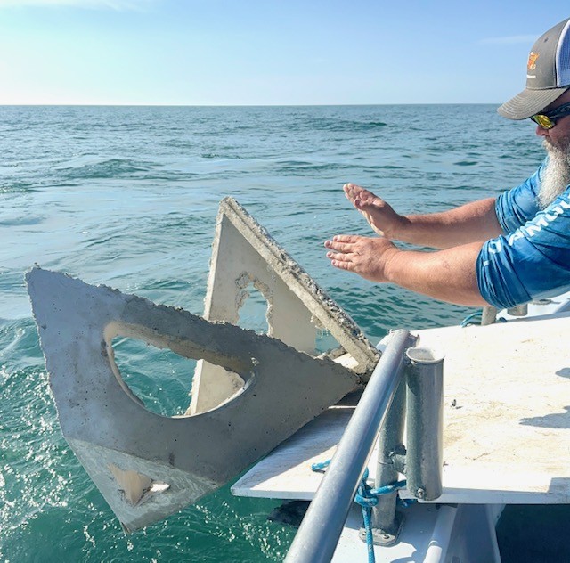 Cleared the inlet with a typical post-holiday light rail; we found yesterday’s seas diminishing in what would become calm water. Had 4 pyramids aboard in lieu of blocks; Big Jon sent them by the rail on Kathy’s Reef.