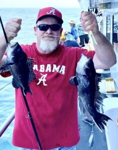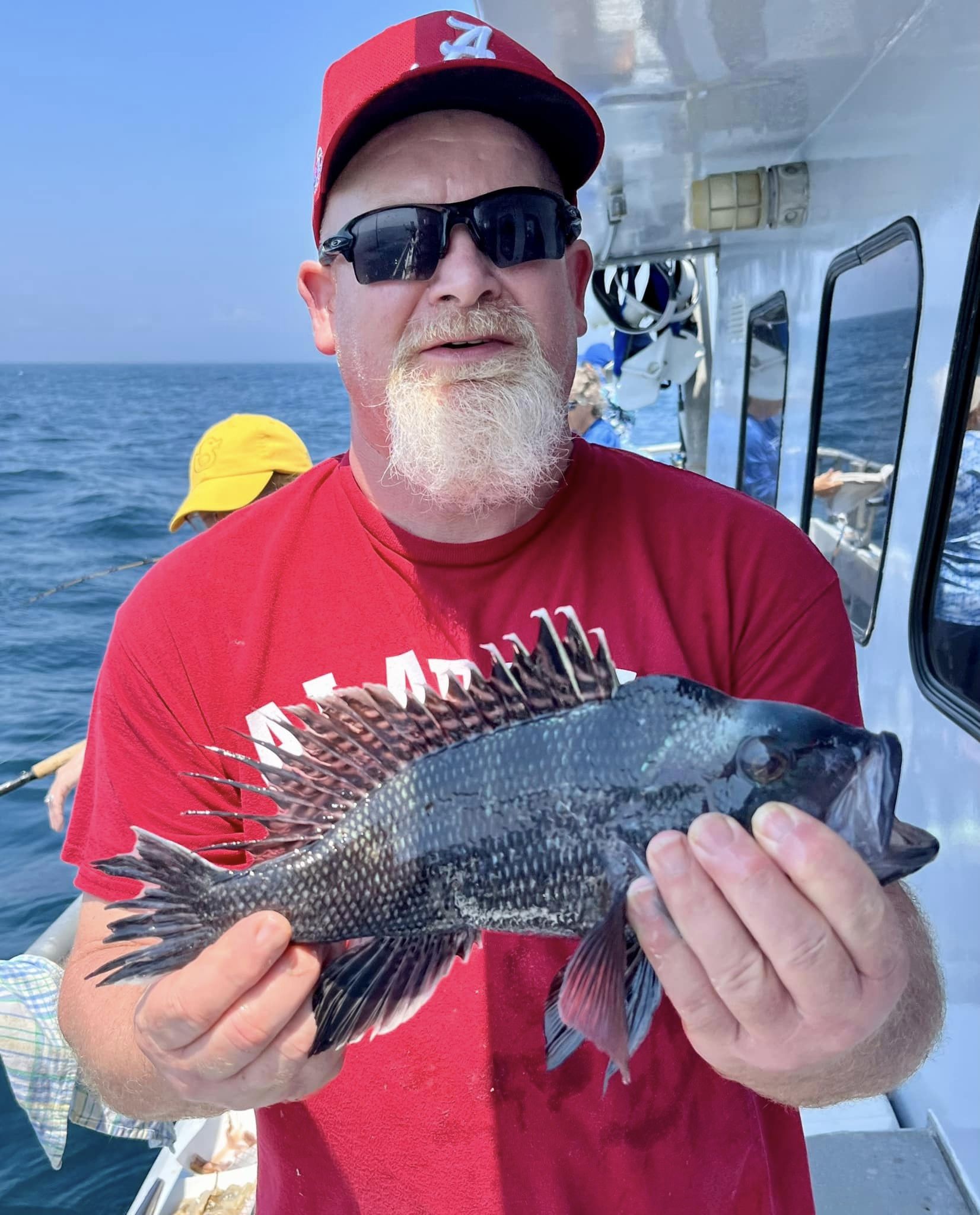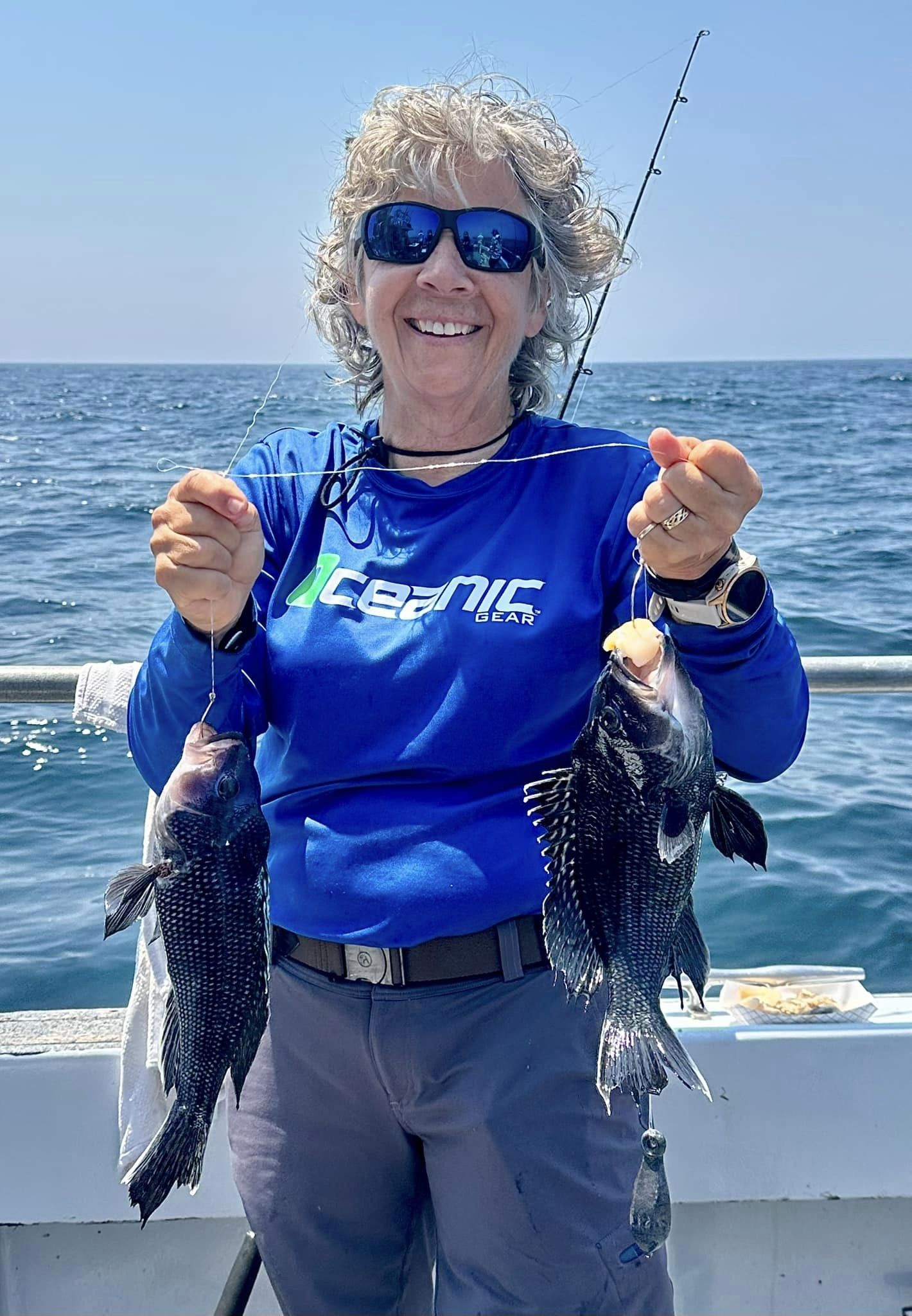 Captain Monty Hawkins of the Morning Star has found a couple of good spots for sea bass and his folks are hauling up some very nice fish.