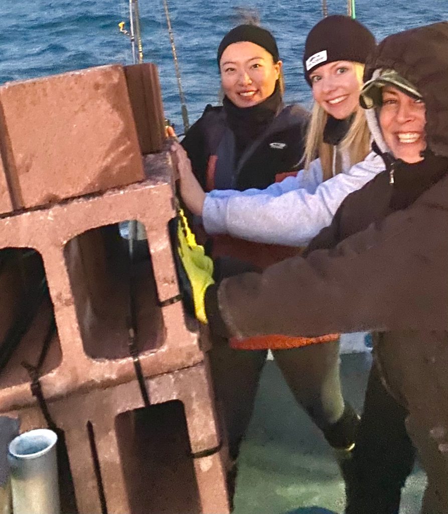 Ladies dropped our blocks over at a reef I’ve worked on a number of years. Should opportunity arise it would be a great place to target with pipe bundles — we drill and cable 3 to 9 pieces of 8ft long concrete pipe into a single reef unit. Takes a special set of circumstances; the right equipment to load and deploy, plus time to build em. Boy are they effective reef though – would that we might ever build them in their thousands. In the Chesapeake & DE Bays they’d become oyster spat cannons; out front marine coral & mussel meccas.