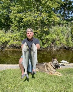 Josh Rosenberger, with dog Luna, caught a limit of bluefish up to 26.5″ fishing on the Line Dancer with Lance Biesecker, Karen Biesecker and Faith Rosenberger.