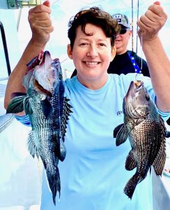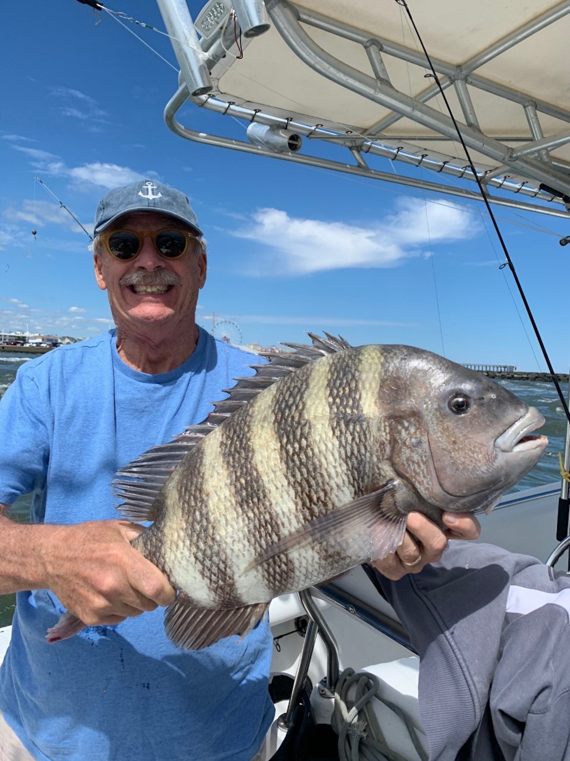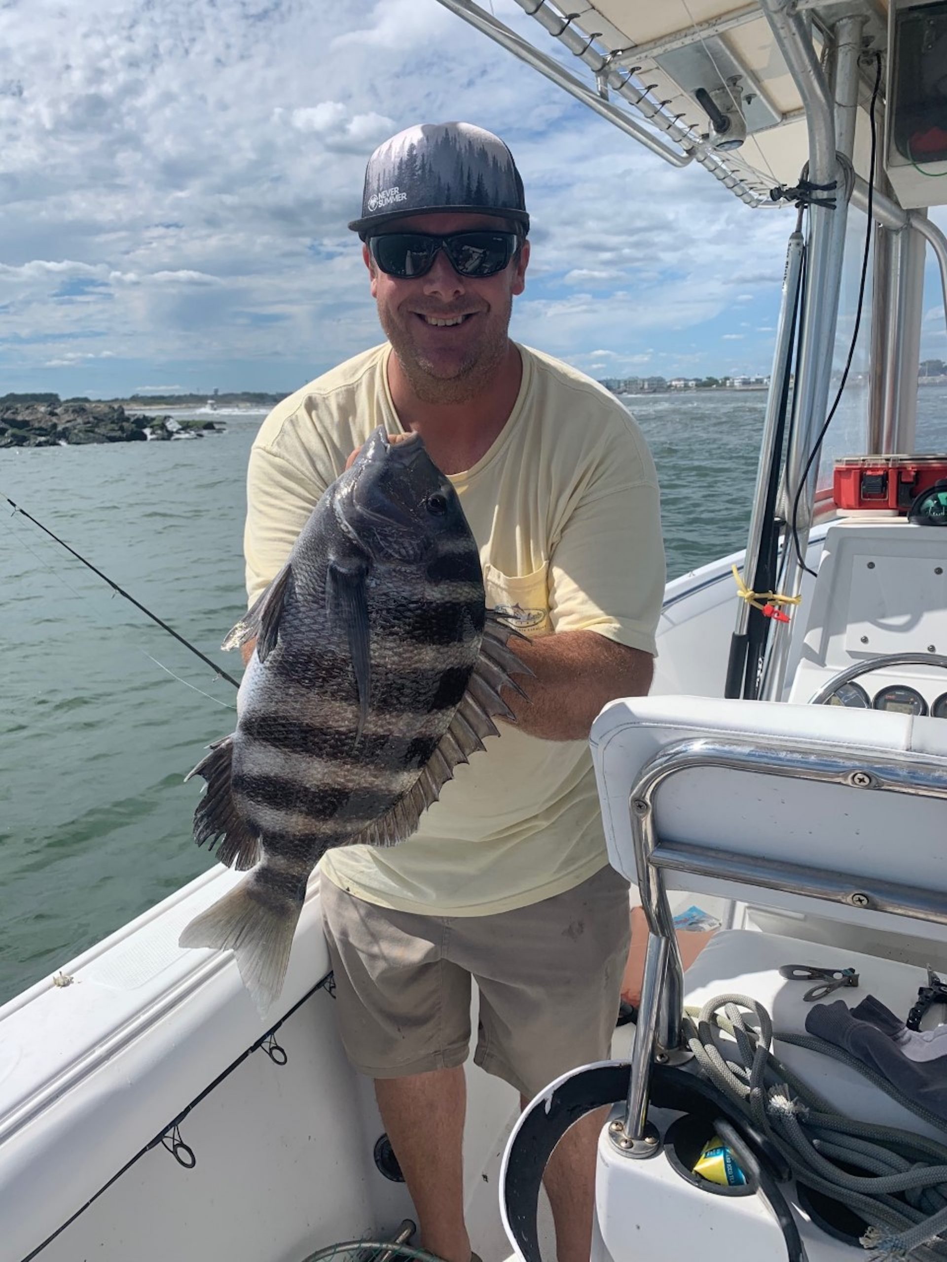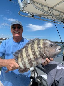 James and David Weller were fishing on their private boat Turn Me Loose on the south jetty today where they landed some very nice sheepshead on sand fleas.
