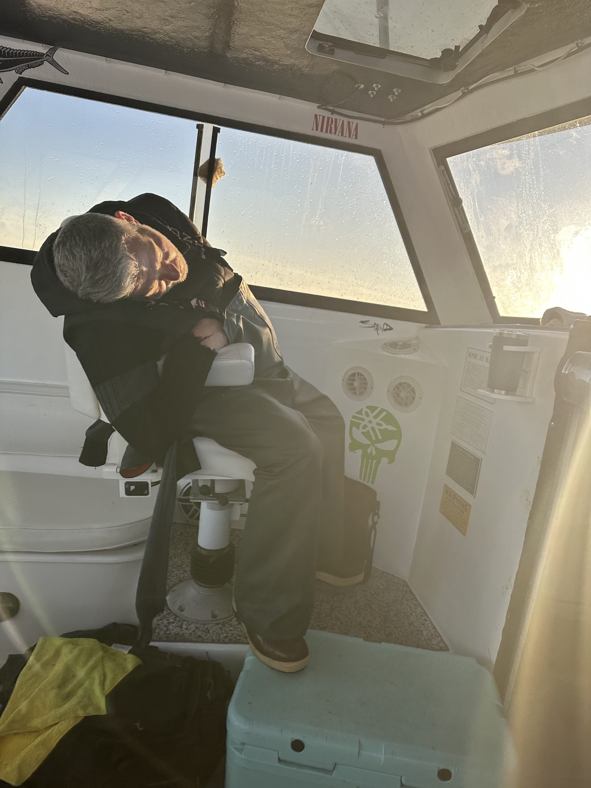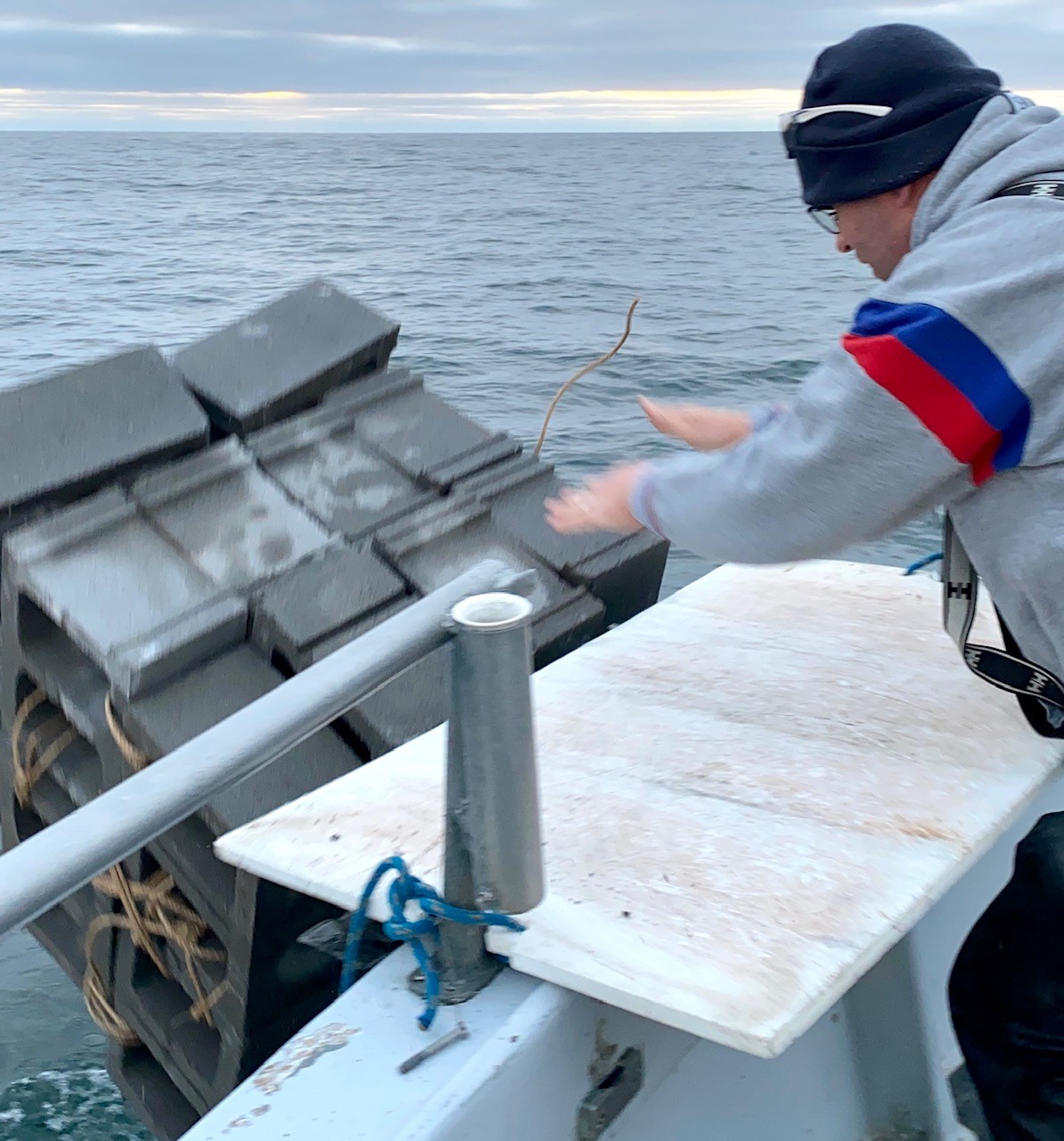 Overcast day made for a lackluster sunrise. At least we didn’t have to suffer more easterlies. Frank from up Long Island gave our reef blocks a shove atop a reef in need of nourishment; we kept paddling.