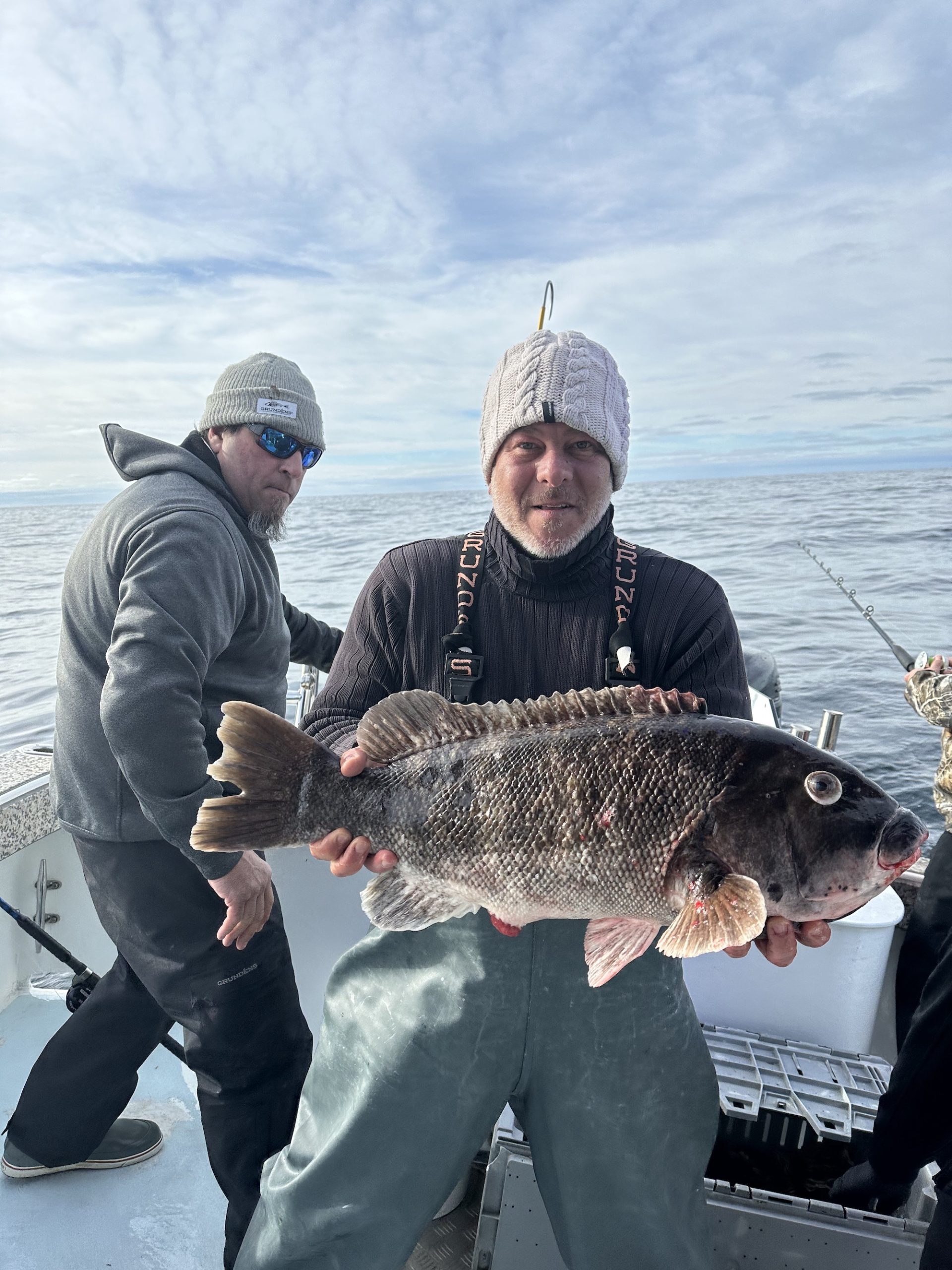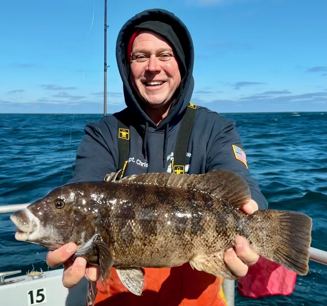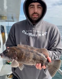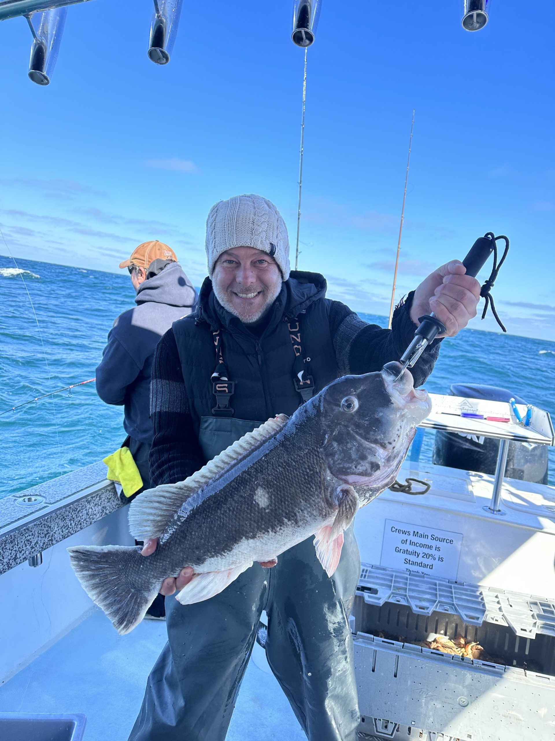 Captain Chase Eberle of Chasin’ Tides Charters didn’t have an incredible day overall, but he did manage some great fish for his crew. Not a ton of action with just 8 keepers going in the box, but there were five very impressive fish over 10 pounds. The five double digit tautog or “DD’s” were 12.5, 13, 13.5, 14 and 17.5. Awesome fish! They knocked one lucky angler out cold!
