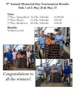 The 9th Annual Ocean City Marlin Club Memorial Day Tournament is in the books and although only 9 boats participated because of the weather forecast everyone had a good time and the Marlin Club was able to write a nice check to the Kratz Memorial Foundation which is what the tournament is all about. Here are your winners with payout amounts. Congratulations to Fish in OC charter partner Spring Mix II with Captain Chris Watkowski!