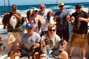 The Fin City crew with angler Jake Fitzsimmons killed this 17″ flounder while drifting the east channel on a live bunker. The crew also released several throwback flounder and some annoying sea robins.
