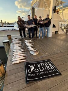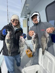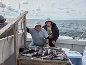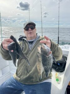 Anglers fishing with Captain Dave Caffrey of On the Run had a great 1/2 day afternoon trip today with 38 sea bass, 6 triggerfish and one flounder. The largest sea bass was a personal best at 22″ and 4 pounds.