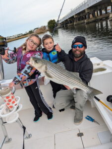 Kevin Stoltzfus of Salty Marine Electronics fished with his wife Jen and kids Lena and Liam and caught 24 rockfish in just two hours today at Route 54. They kept one 30” keeper for the cooler.