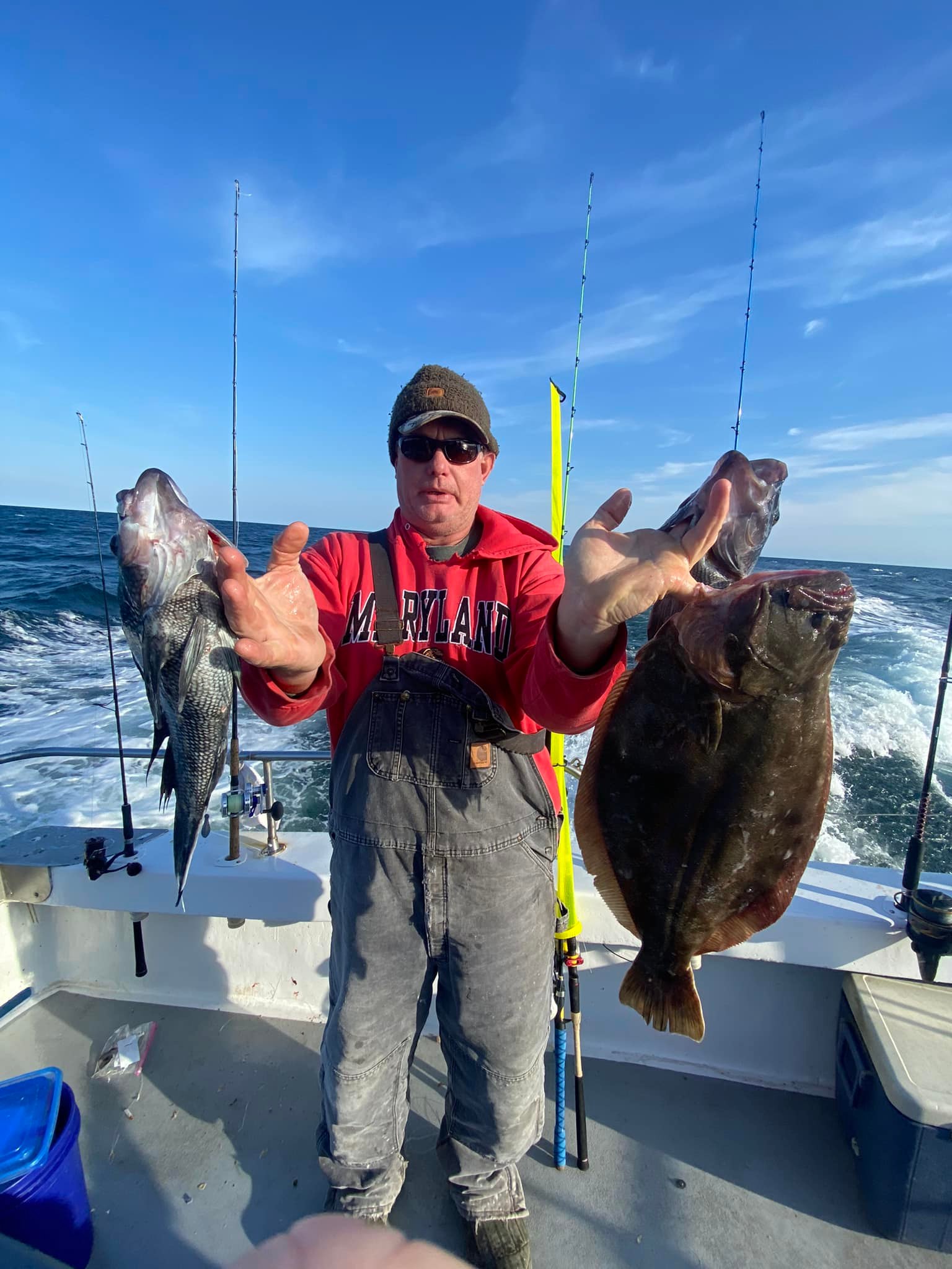 Summer flounder are moving further and further from shore as they head to their winter spawning grounds, but there are still a few being caught on the wrecks and reefs off of Ocean City.  Captain Kevin Twilley had the crew of Fish Bound out today and had a couple of nice flounder with the biggest at six pounds.  These were in addition to a boat limit of fat sea bass as well.