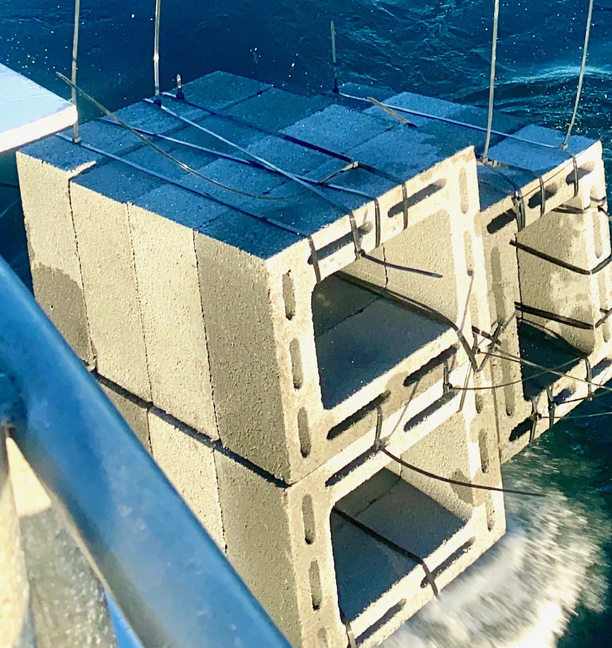 Dropped 12 tog penthouse blocks strapped into a unit atop Capt. Jack Kaeufer’s Memorial Reef and headed east.