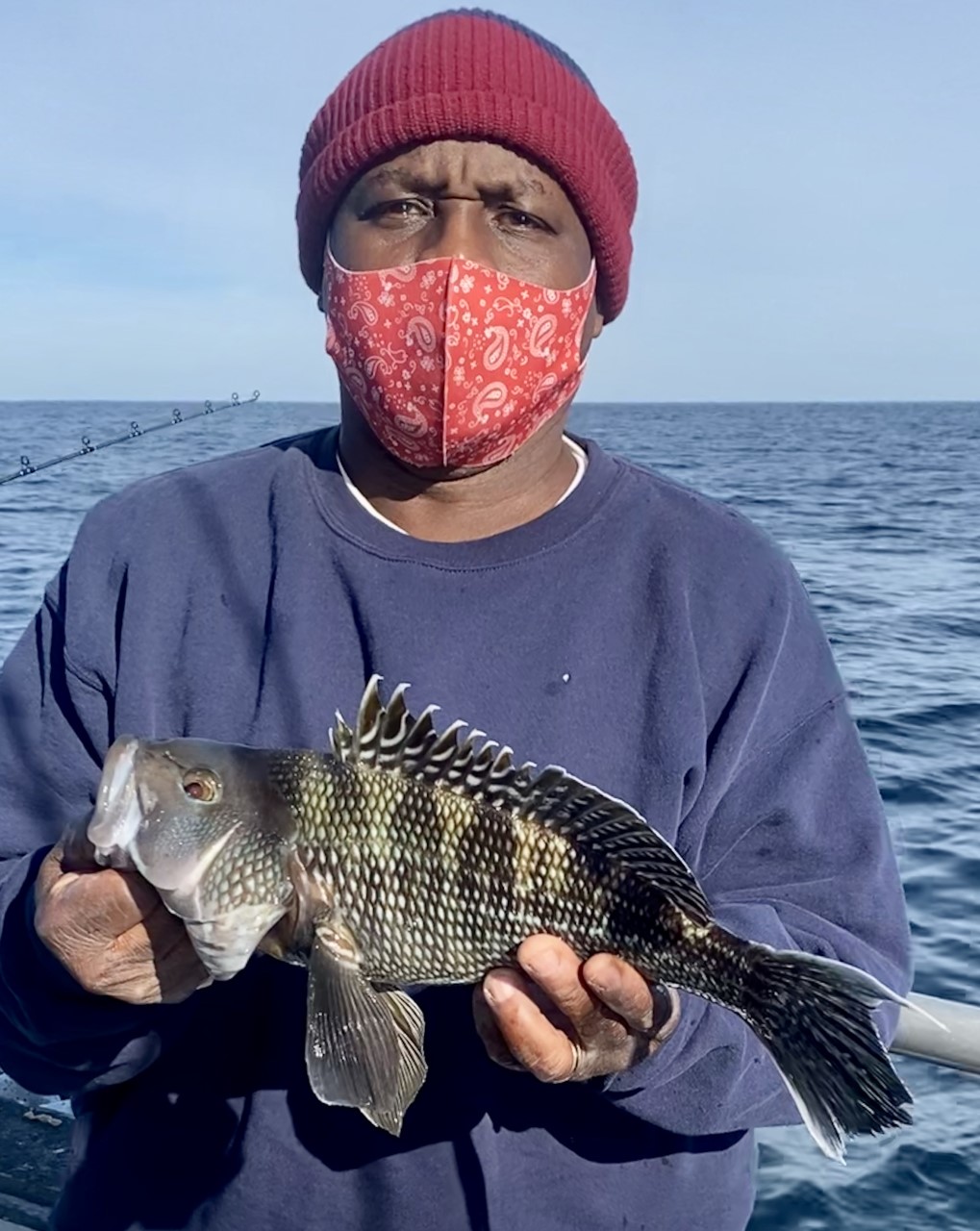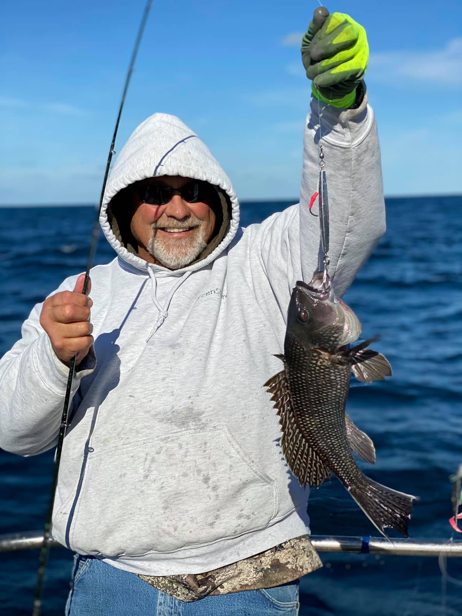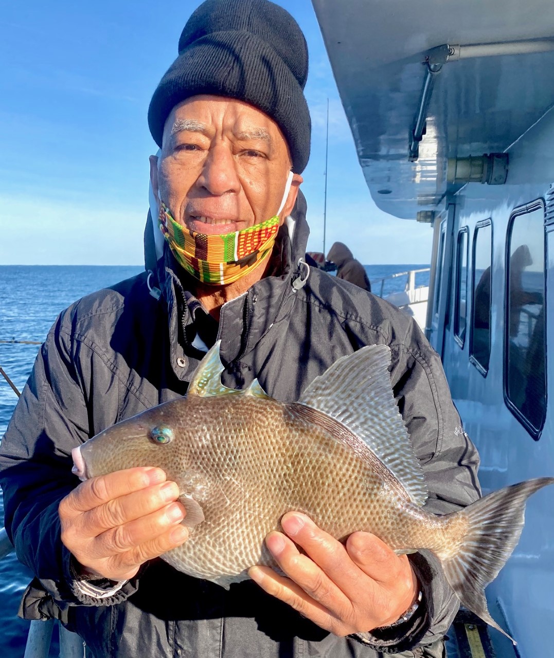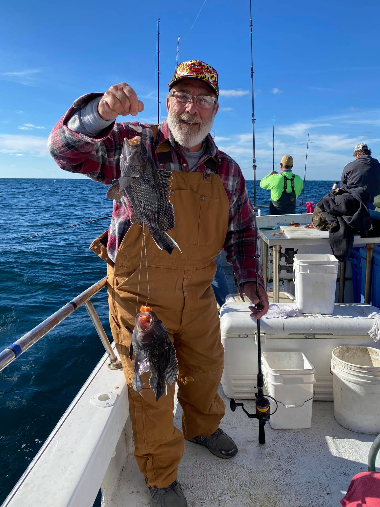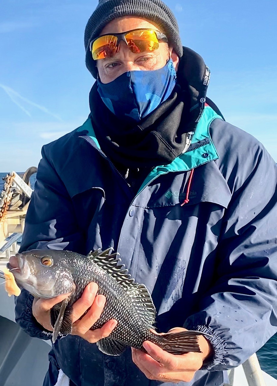 No whales, dolphin, or sea turtles today. Did see a smallish mola-mola a few feet off the transom. We found todays sea bass bite steady if unremarkable—not at all what we’d usually see in late November—Really had to work for fish in the box. Vince Jones of York PA pulled a clean sweep. He had our first (& only!) limit at 11:40am; then won the fish pool and reef raffle!