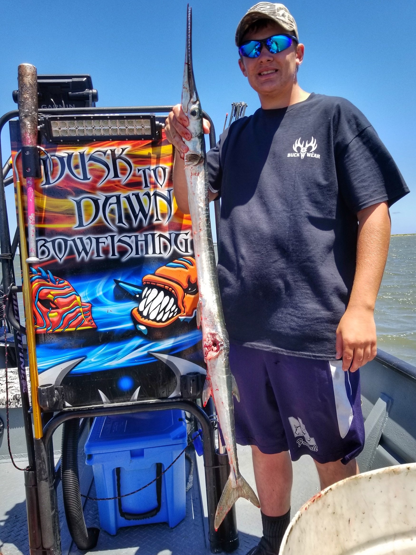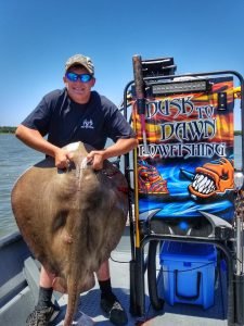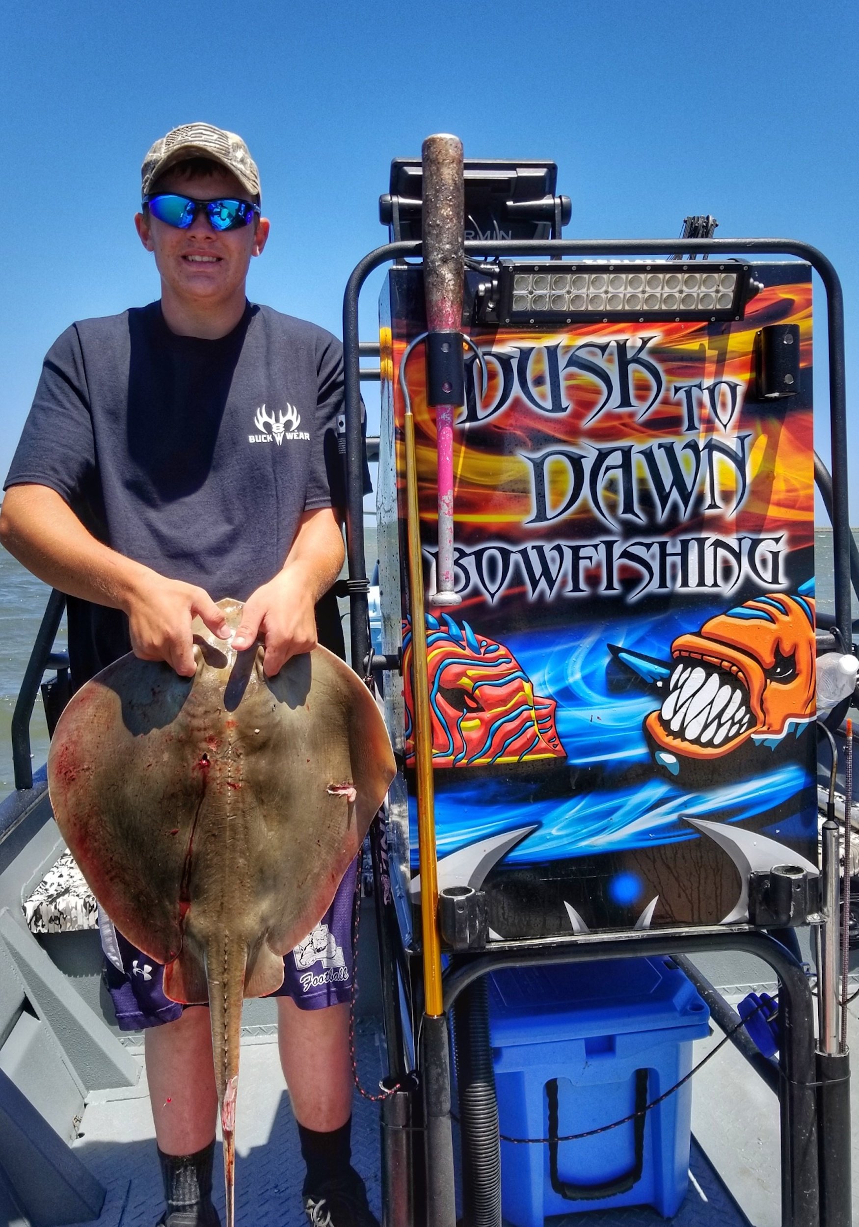 Captain Marc Spagnola of Dusk to Dawn Bowfishing was out in the t0ugh conditions this morning trying to find some good targets for his shooters. Like usual Captain Marc found the clean water and some good action putting some southern rays and a houndfish in the boat.