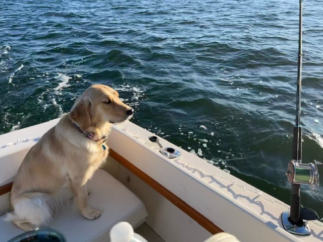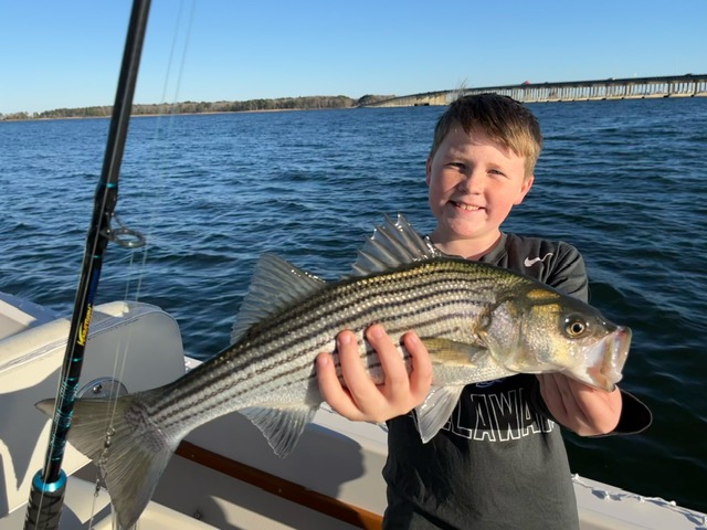John and Grayson Wooldridge couldn’t pass up the opportunity to try some rockfishing today with the nice weather conditions. The guys were happy to find some fish still snapping north of the route 90 bridge in the mouth to the St Martin river. They found the water a very clear 45 degrees and they also found some nice fish that they caught and released on trolled Rapala baits. Annie the dog was even on lookout.