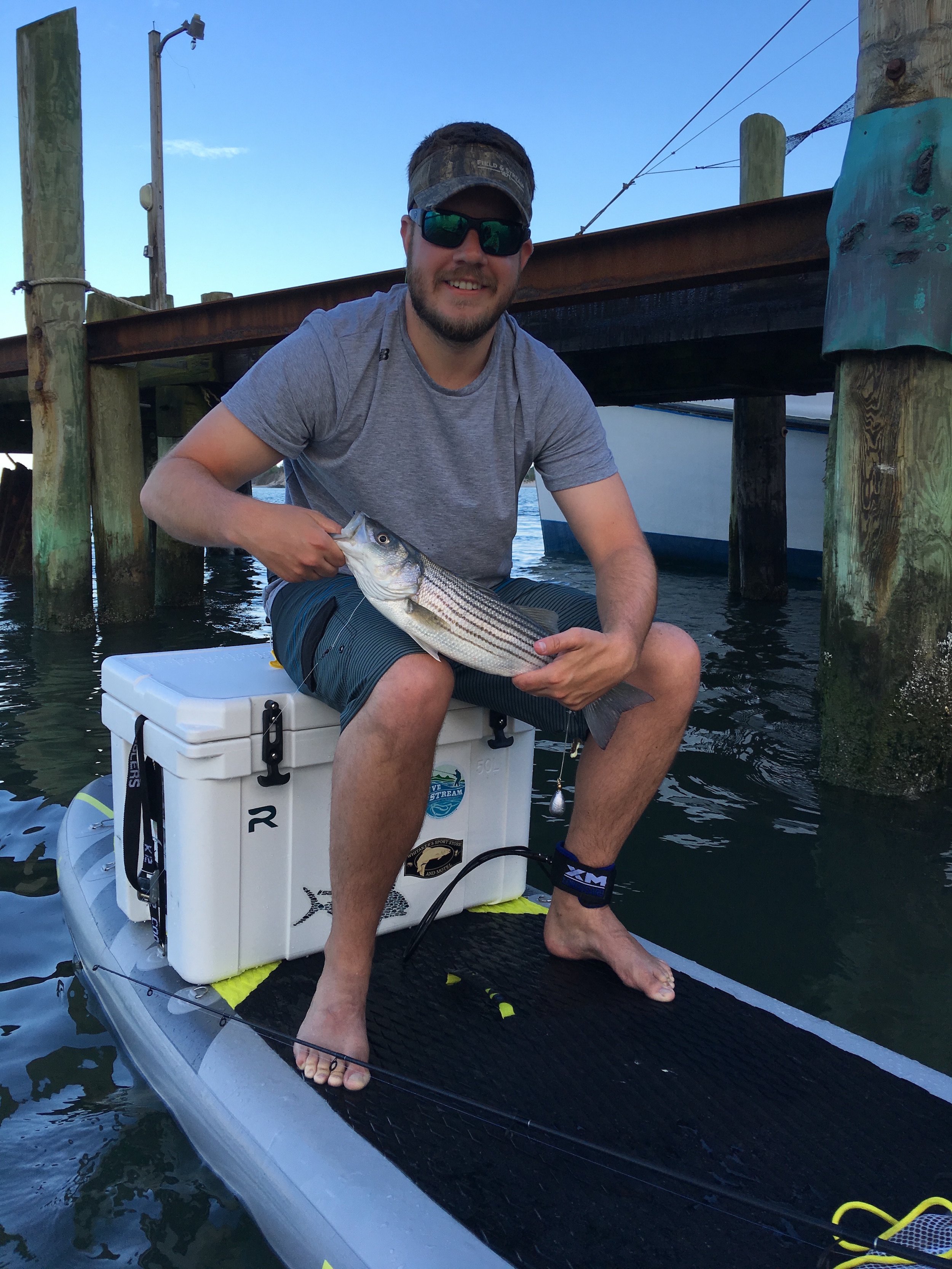 I got a cool report from Brian Roberts of the Huk Big Fish Classic that you don’t see everyday. Brian took his buddy Ian Gifford of Olney, MD on his first paddle board fishing trip and Ian caught and released four throwback rockfish on peeler crabs. It takes a good amount of skill to even stand up on a paddle board so catching fish on one deserves some respect.