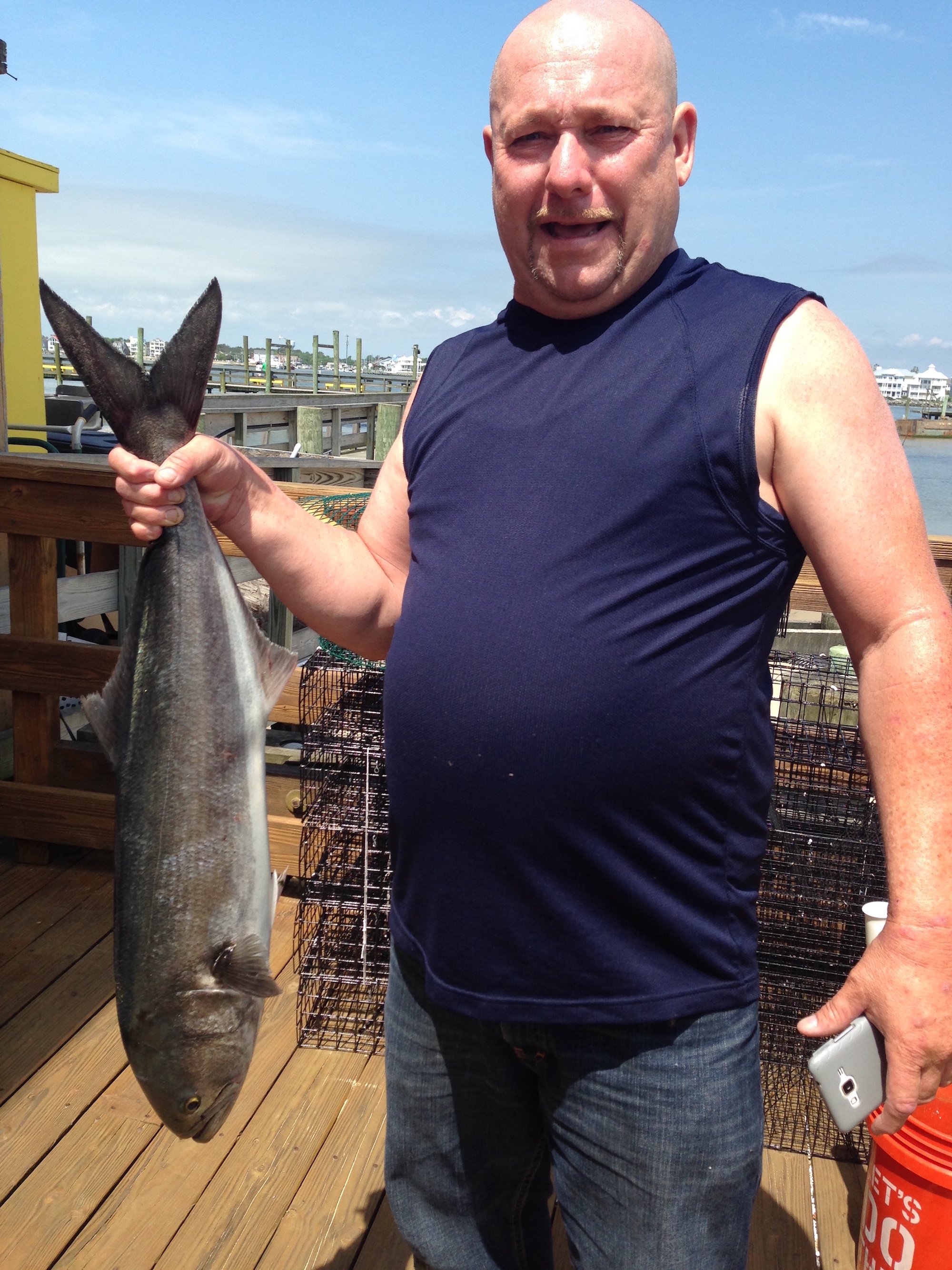 Below Mike Harvey from Glen Burnie, MD caught this 36″, 13 pound bluefish on a live minnow at the Oceanic Pier.