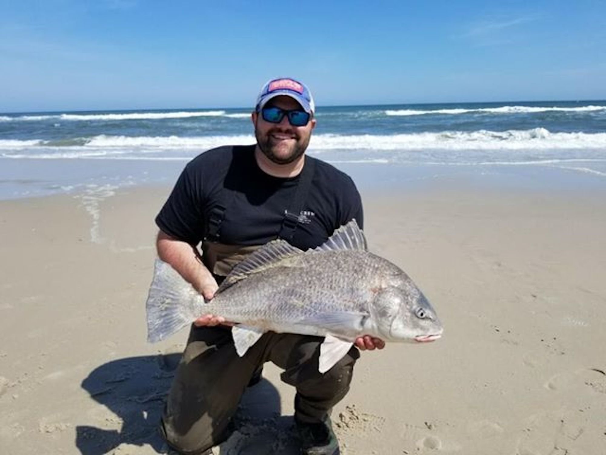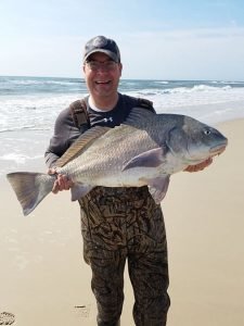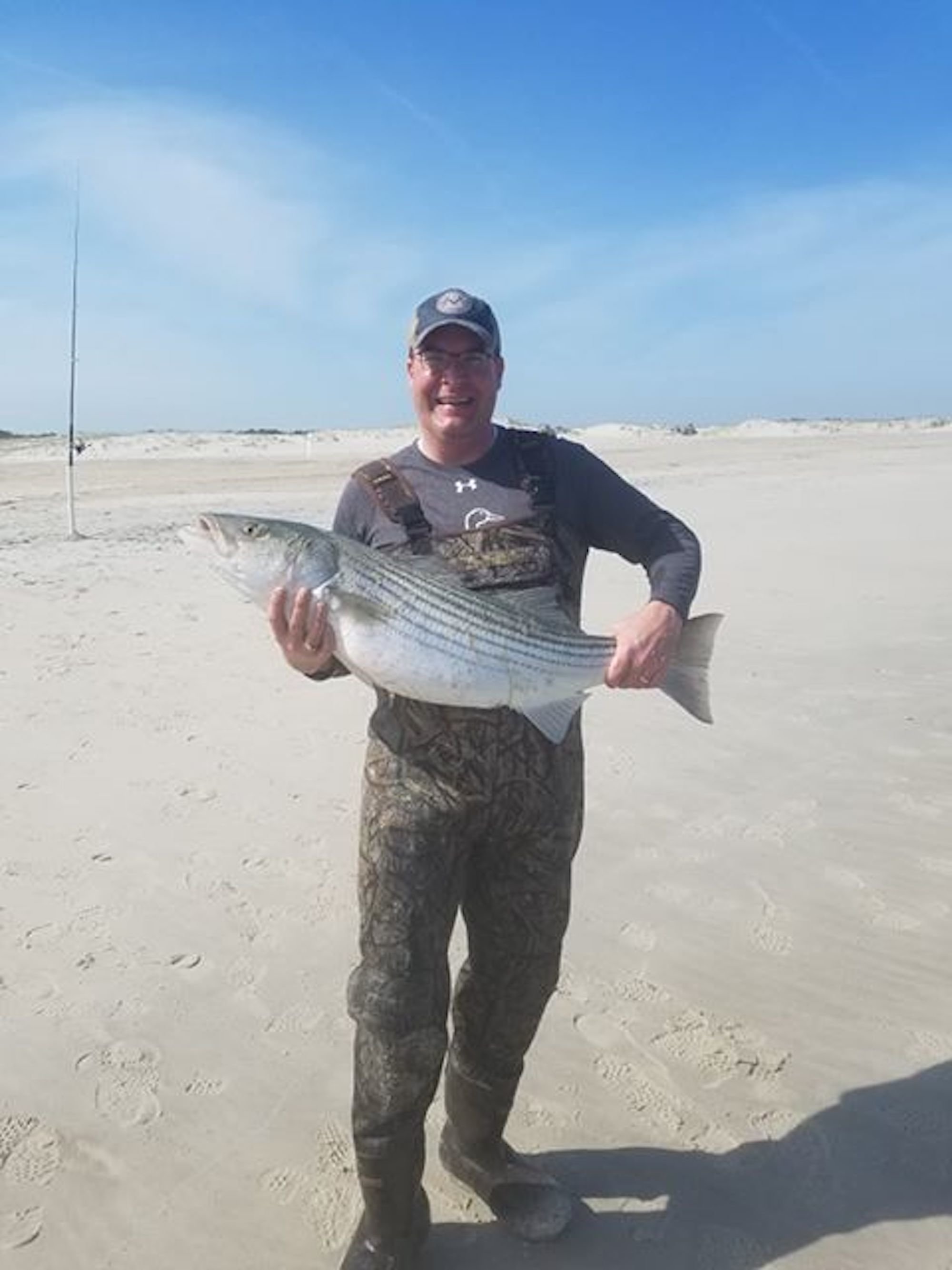 Lee McCabe and his buddy Steve Sweigert fished the Assateague surf yesterday afternoon and had some reely good luck. Lee and Steve caught two nice black drum, keeping one of 37″, and a bonus striper that was too big and too small on sand fleas and fish bites. The striper was 42″ long which is well over the 28″ minimum size, but fell in the slot of 38″ to 44″ that must be released. In plain english stripers must be greater than 28″, but less than 38″ or over 44″ to harvest in MD waters…..and that’s for now. Striper regs look to be changing in the future so we’ll see where we end up.