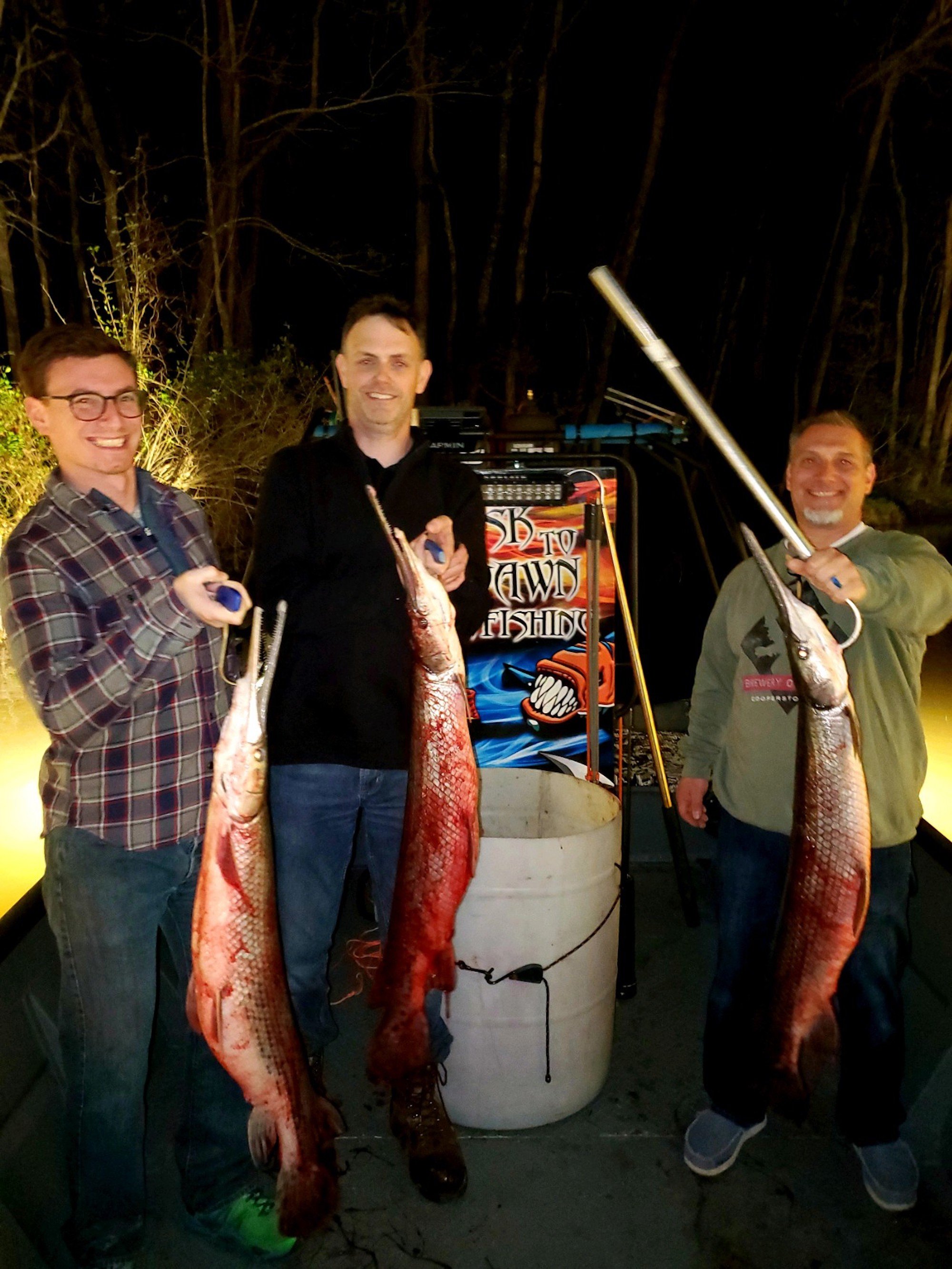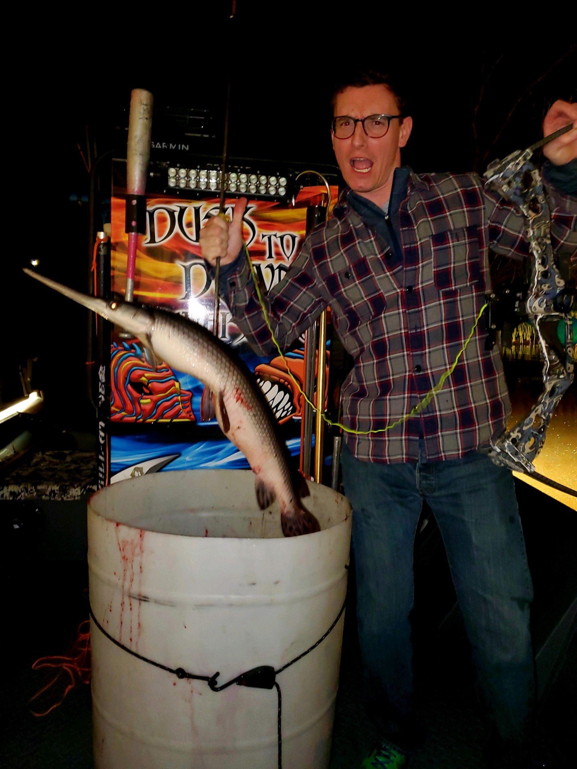Captain Marc Spagnola of Dusk to Dawn Bowfishing was out on a windy night last night, but was able to find some cover and put his clients on some good shooting. Captain Marc and crew thwacked several nice gar up to 18 pounds.