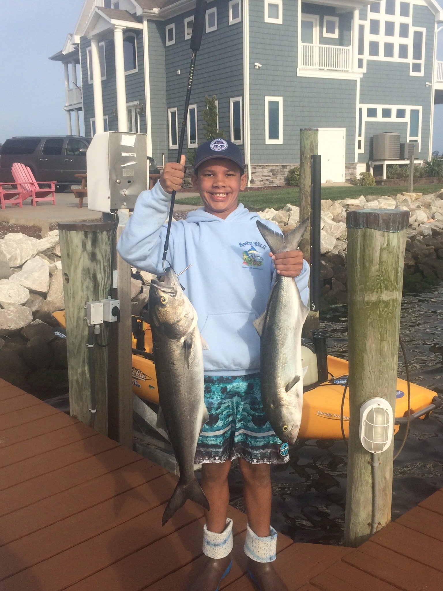 Ayrton Pryor was at it again this afternoon and caught some nice bluefish behind his house in the bay behind Keenwik on the Bay. Ayrton fished from his kayak again with top water lures and bucktails and landed six nice bluefish. Four fish were released and he kept two fish of 8 and 12 pounds.