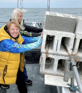 Not as easily discerned, there are many more blocks & block units among the 2015 Iron Lady concrete deployments at the top of the picture seen as ‘smudged’ areas. (Believe me – that concrete is great reef! Pic of two fluke taken there a couple years ago..)