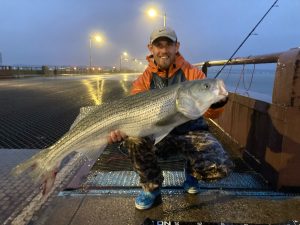 The wind and rain didn’t stop some fishermen from hitting the route 50 bridge both this morning and this evening.  Sometimes a rough ocean will have fish move into our back bays and it seems like that is exactly what’s happened.  I got the below pic this morning of Morgan Mericle who was having a ball fishing from the route 50 bridge and said the stripers were snapping!  Morgan had six fish between 29″ and 31″ that fell right in the 28″ to 35″ slot.  He also released some fish larger than the slot with his largest at 40″.  Morgan reported that other anglers were having great luck too.  Hopefully they stick around for next week’s OC Inshore Classic tournament!