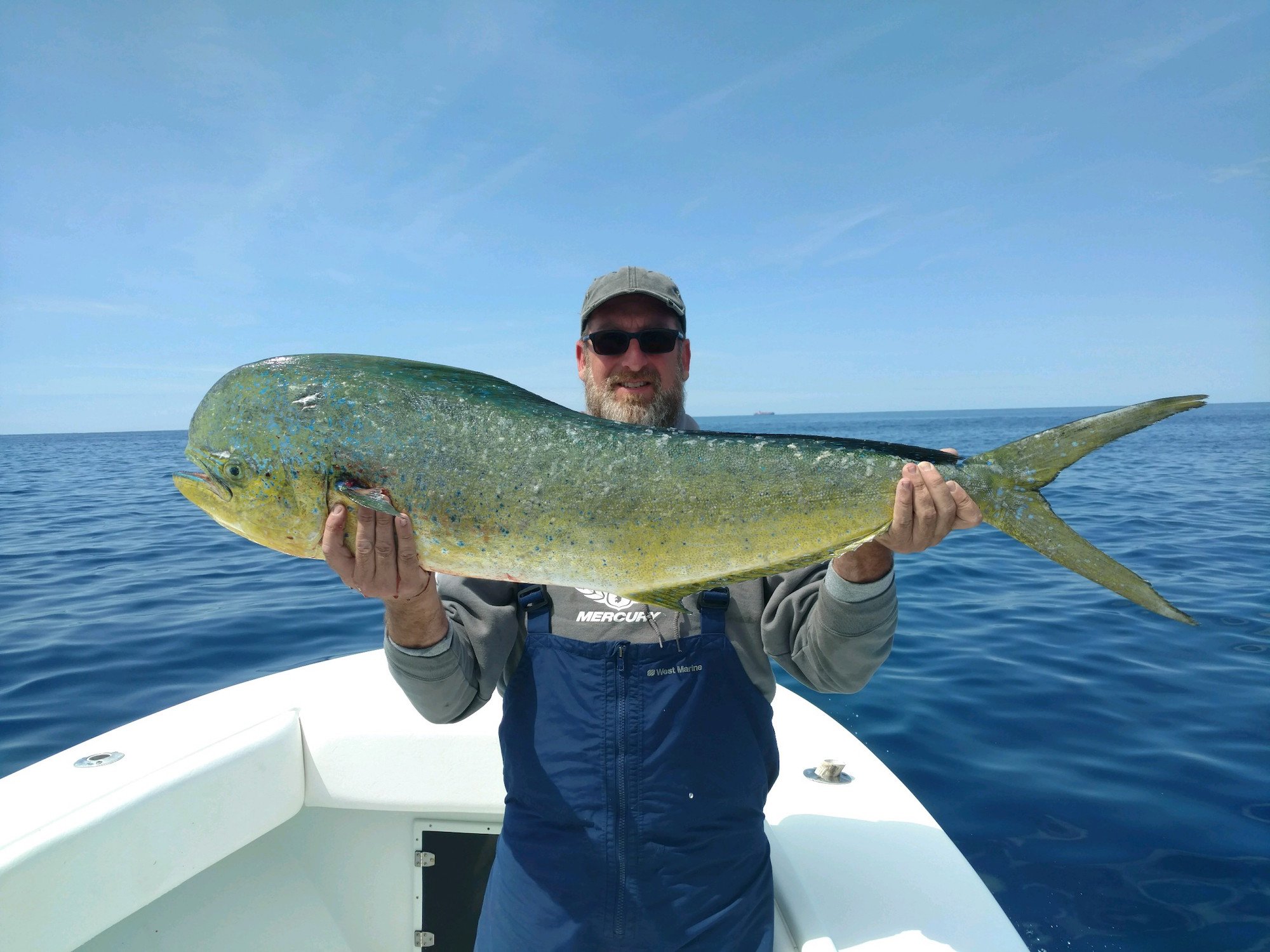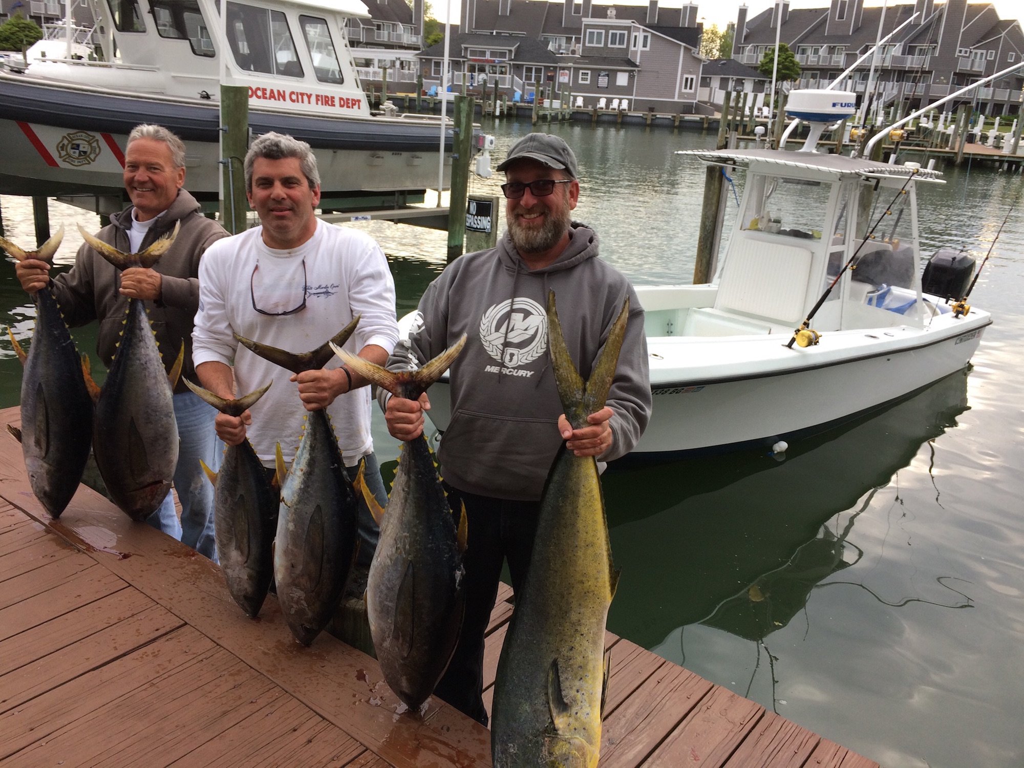 My buddy Eric Mihaly had the Bet Sea out today and had a great day offshore. Eric, Dave Nornes and Rob Kohut ventured 86 miles out to 1000 fathoms between the Washington and Norfolk canyons and boxed five yellowfin tuna and one stud of a bull mahi that weighed in at 22 pounds. You can tell by the photo that it was slick calm off there. Way to go guys!!