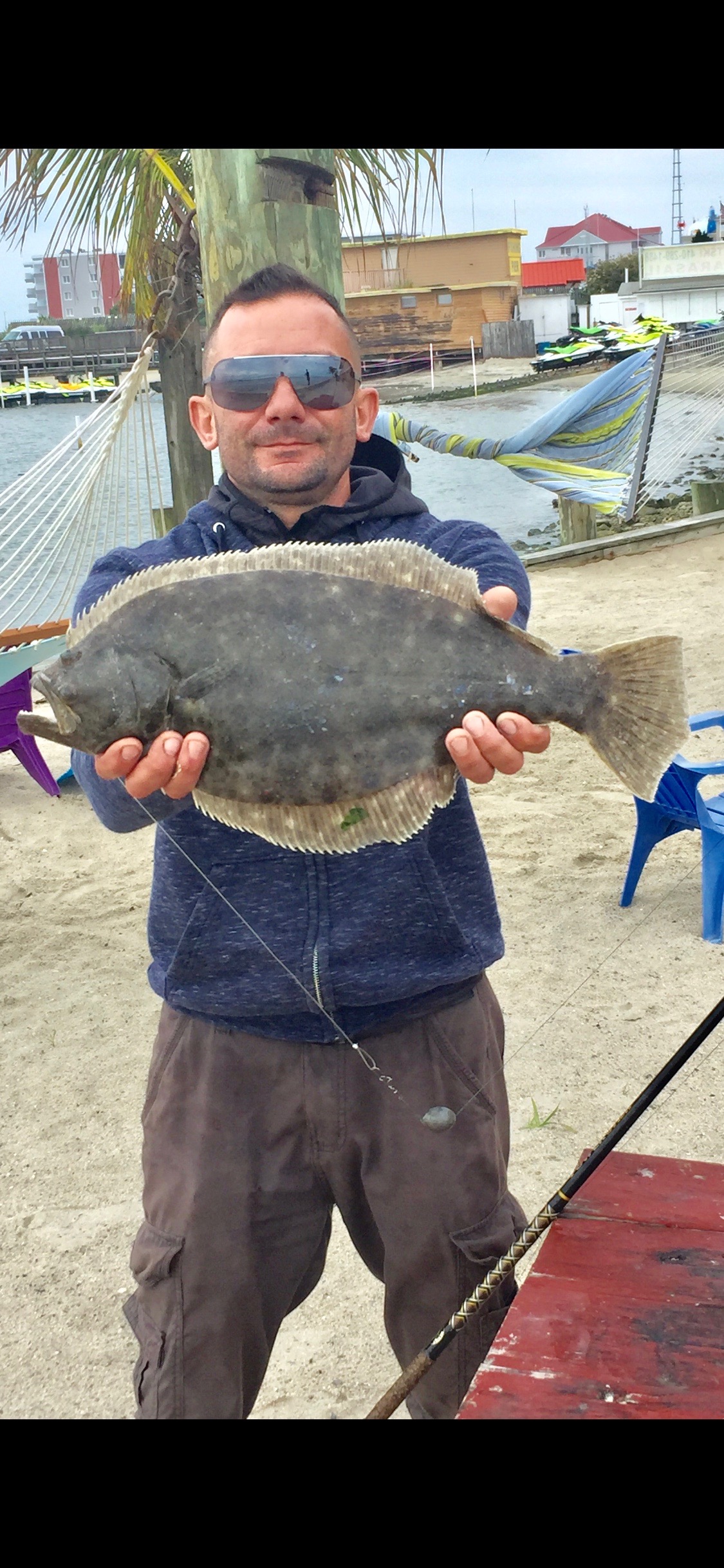 Bear down at the Oceanic Pier sent in this photo of Anatoli Georgiev with a fat 19″ flounder that he caught from the north sea wall on a live minnow.