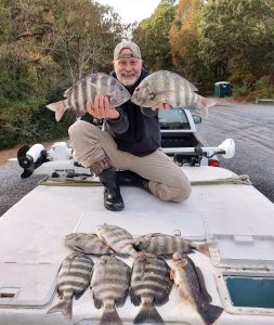 Yesterday, Heath Huskey and Nate Gregory fished the south jetty at low tide with live sand fleas and had a limit of sheepshead and some bonus tog.