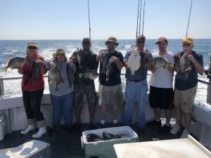 Captain Monty Hawkins of the Morning Star took a 12 hour trip today to get a little further from the dock and the trip ended up being well worth it.  Captain Monty ended the day with triggerfish, flounder and a boat limit of nice sea bass.  One client was throwing back 15″ sea bass and still kept her limit.  The fish pool winner was Kevin Dougherty of Bethany Beach, DE with his 20.5 inch Flounder – Cathy Creel of OC ahead the biggest sea bass and trigger, 19 & 17 respectively – Also pictured are Lawrence Winston of Columbia, MD – Patrick Mulcrany of Harrisburg, PA – Tom & Josh Grover of Annapolis- & Julie Maugins of OC.