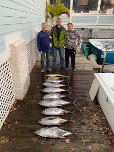 Captain Jeremy Blunt of the WRECKER out of the Ocean City Fishing Center found a three degree temperature break offshore today and was able to pull eight yellowfin tuna and two mahi.
