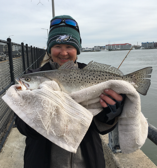 Bear down at the Oceanic Pier sent this photo of Chrissie in who was at it again catching a pretty speckled trout from the route 50 bridge.