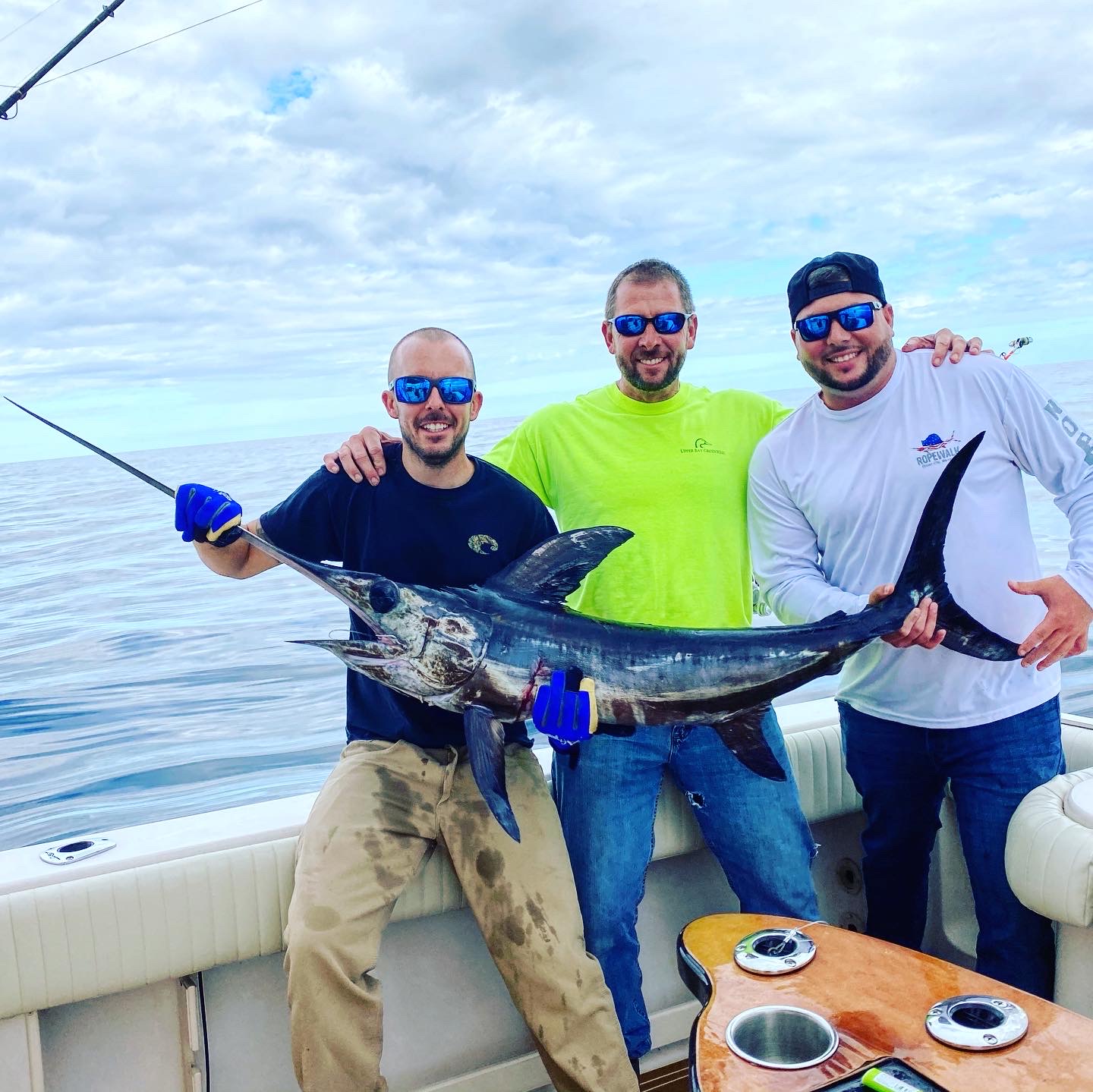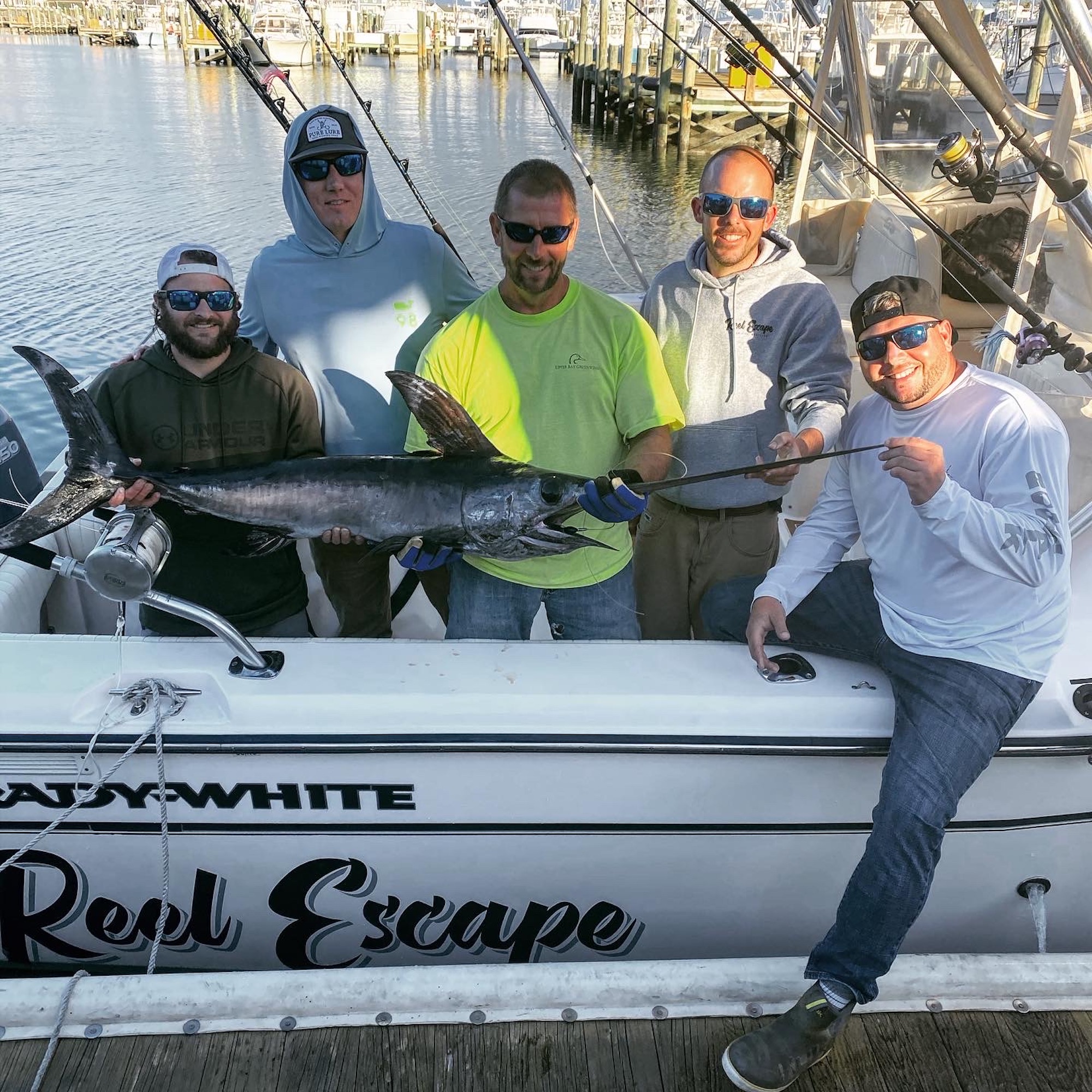 Most of the offshore species have left the area, but one that sticks around pretty much all year is the swordfish. Water temperatures on the bottom of the ocean in 1,000 or more feet are pretty consistent all the time and that’s where swordfish live and eat. There is one less swordfish in the deep blue sea today thanks to the crew of the Reel Escape out of Pines Point Marina. Jeremy Banover, Joe Bish, Carl Sauer, Chris Miller and Jordan Sauer hand cranked this sword on a beautiful sea today.