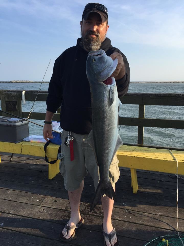 The bluefish bite at the Oceanic Pier in downtown Ocean City is really good on the top of the tide. This angler holds a nice chopper bluefish recently captured at the pier. Anglers are having their best luck with the bluefish on spec rigs and Gotcha plugs.