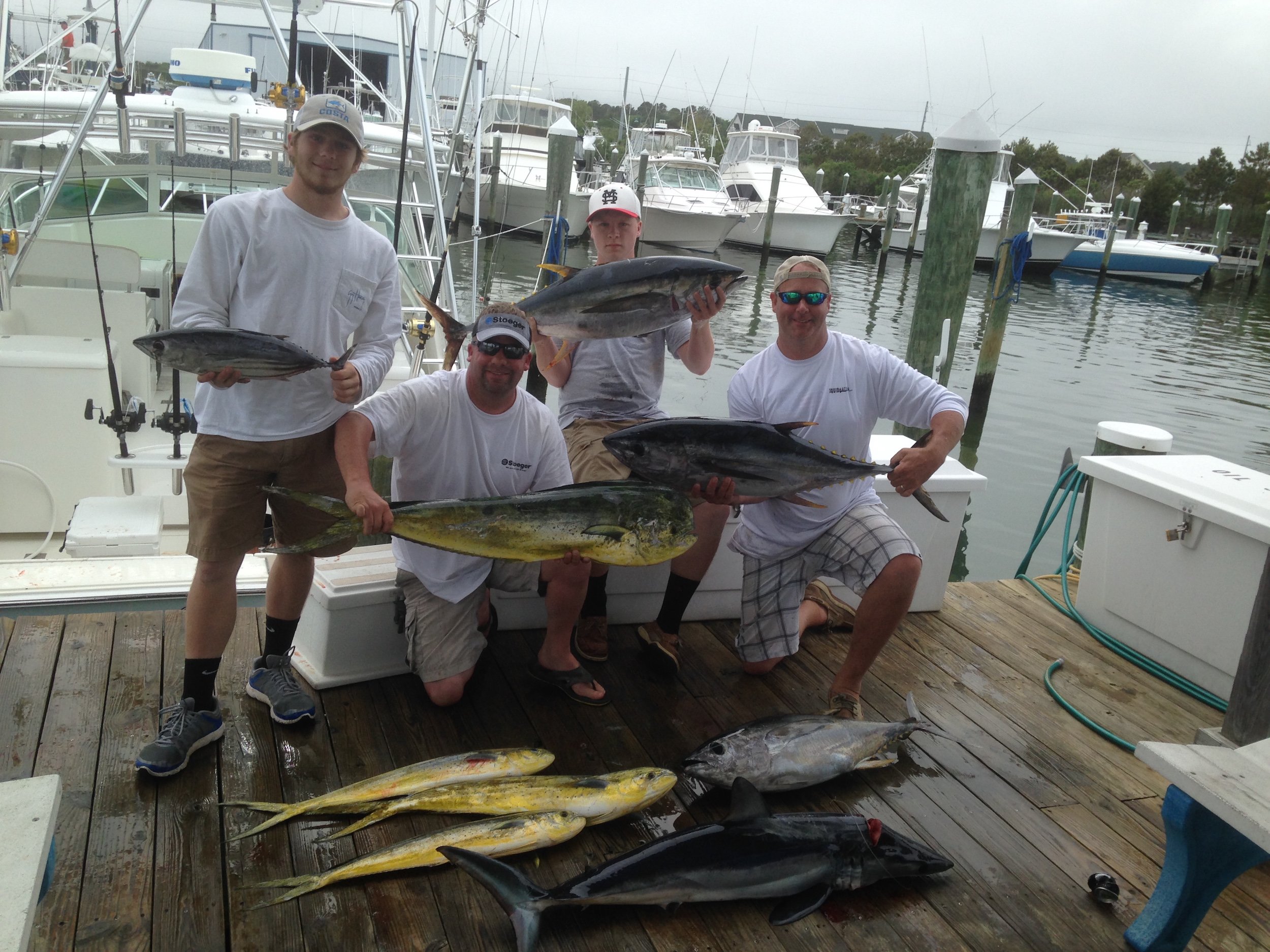 Captain Dave Black fishing on My Cin, also out of Sunset Marina had a good day in the Norfolk Canyon yesterday. Captain Dave put Rick, Keith, Brandon and Tucker Tubman on three nice yellowfin tuna, some nice gaffer mahi and a keeper mako trolling ballyhoo in the Norfolk. The crew also released another 12 smaller yellowfin and lost an estimated 400 pound mako after a 15 minute fight on monofilament.