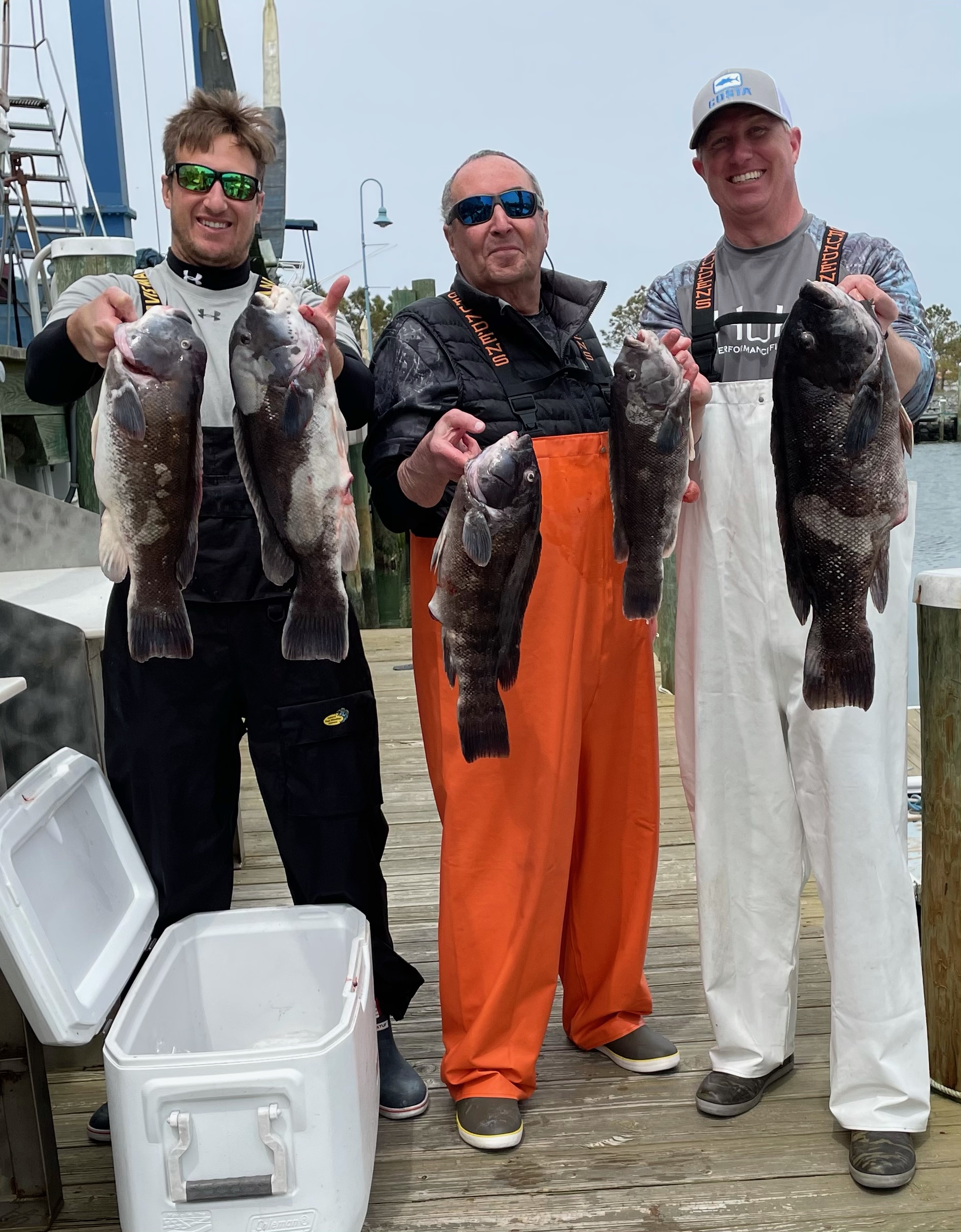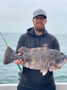Jason Stokes, Wayne Grossman and Ryan Cowder hit the wrecks today looking for tautog and found them. The guys had a great catch on green crabs and white leggers and the largest fish belonged to Ryan at 24″ and 10 1/2 pounds.