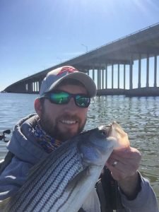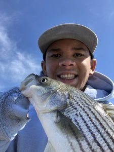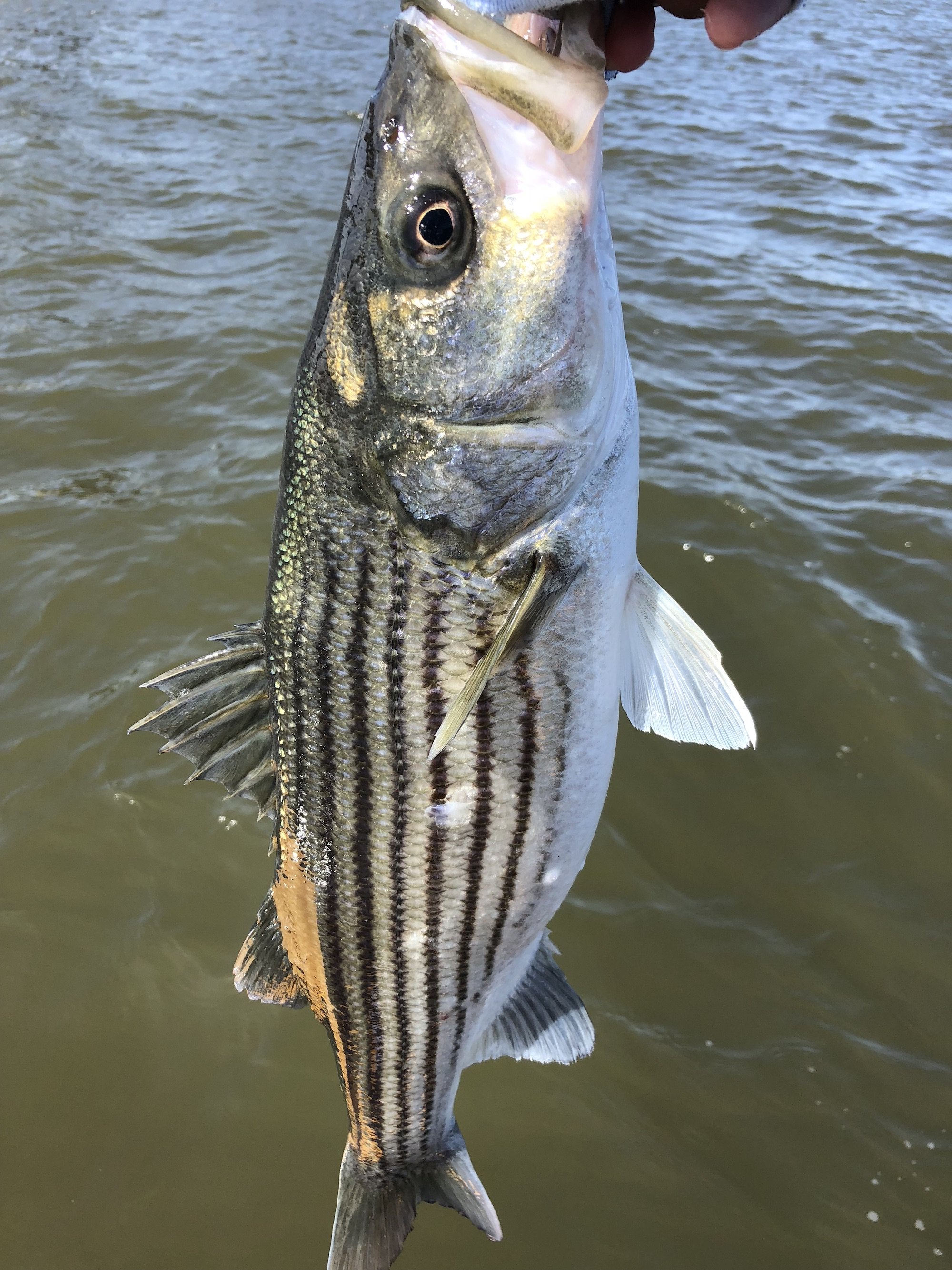 Ayrton “The Kayak Crouton” Pryor fished the route 90 bridge in his kayak today as well and was spotted by John as he caught and released fish. Ayrton caught and released about 20 rockfish on shad bodies with the largest coming in at about 26″. Ayrton also found what some of these rock are in here after when he snagged a bunker from a large school going by.