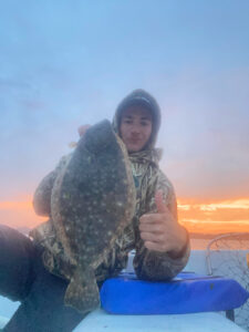 Donny Post used an orange Deadly Double and a salmon red (orange) Gulp in the Thorofare this evening and tricked this nice 20” keeper flounder into the net.