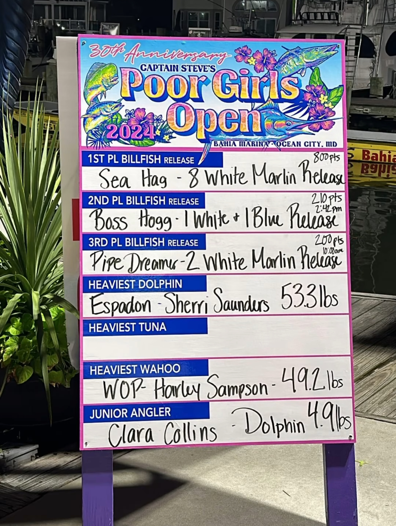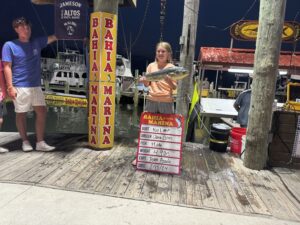 Today was day 1 of the 30th Annual Captain Steve’s Poor Girl’s Open and it was a very busy day at the scales. I was working at Bahia Marina in 1994 when Steve Harman got the idea to start the Poor Girl’s Open and was involved with the planning and setting up of the first ever event. I’m not sure if Captain Steve thought that the tournament would get to where it is, but I’m sure he’s looking down awfully proud of what he started. I’m honored to still be a small part of it as Emcee. Congratulations to Steve’s brother Shawn, his daughter’s Jocelyn and Taylor and all the rest of the Bahia Marina family on an awesome 30 years! Here’s who’s leading after the first day of fishing.