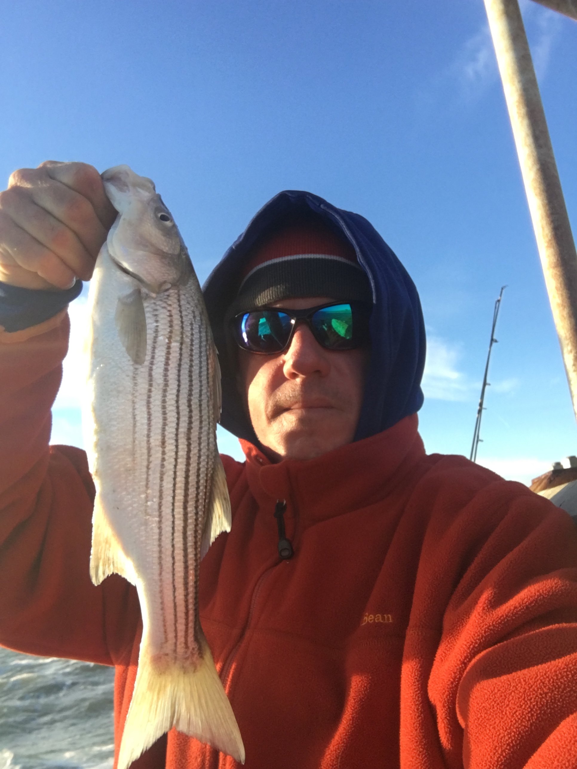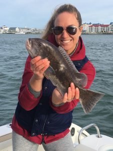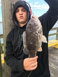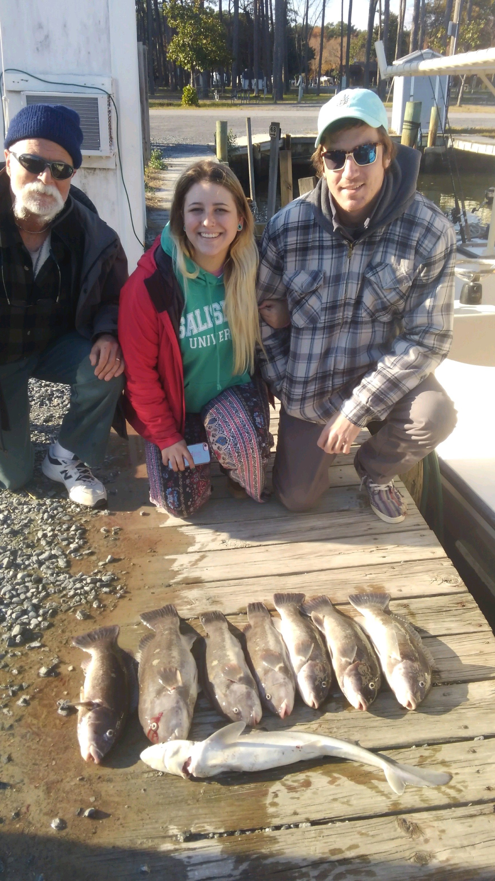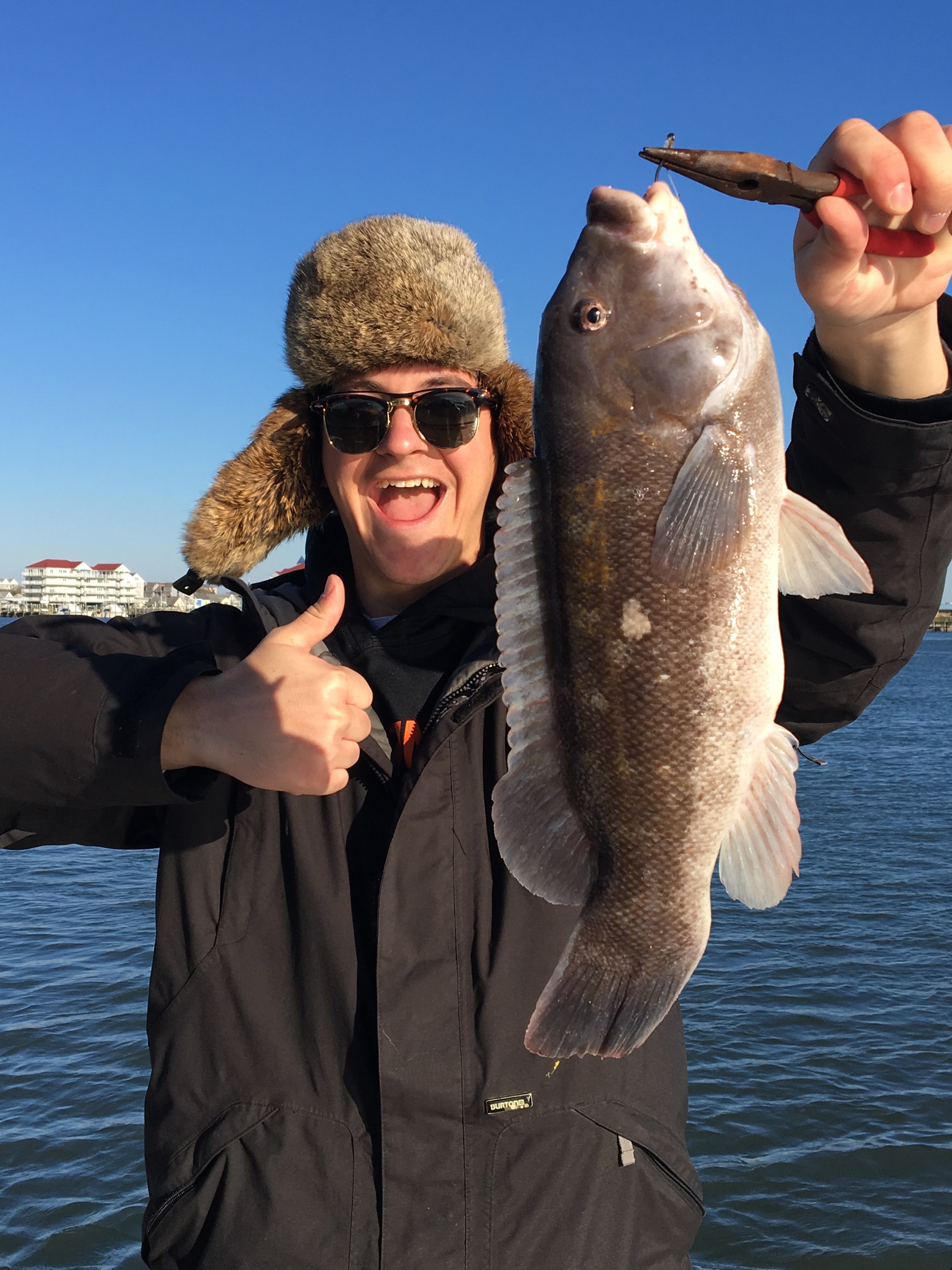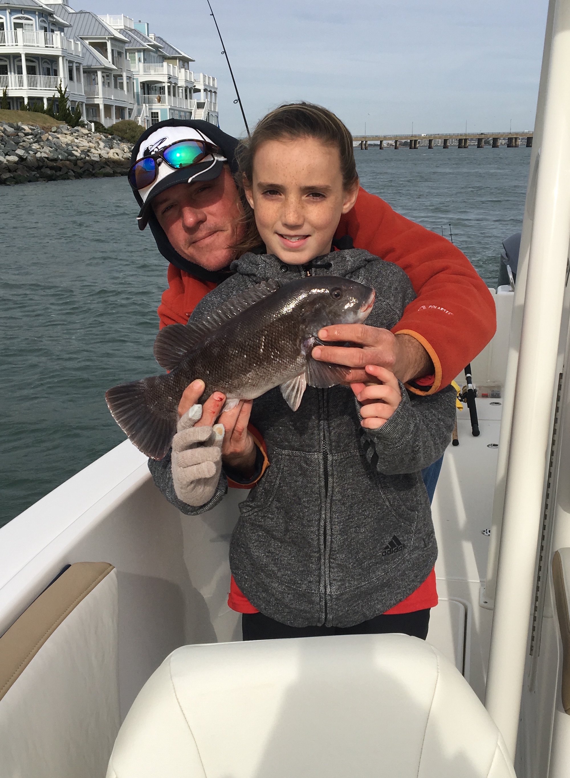 My buddy Steve Tapley is in town with his family for the Thanksgiving holiday and they’re from Bowie like me so they like to fish. Steve’s brother Adrian purchased an awesome Century center console from our friends at Racetrack Marine this summer and they have been putting it to great use. Steve will hit the north jetty, stinky beach or the route 50 bridge even if the boat isn’t an option and he’s having a great week of fishing so far. Steve fished the north jetty and Martha’s Landing on one outing and had some short rockfish and one keeper tog caught by Ben Gurtshaw. On another trip it was some throwback tog at Martha’s Landing and keepers for Maddy and Erin Tapley.