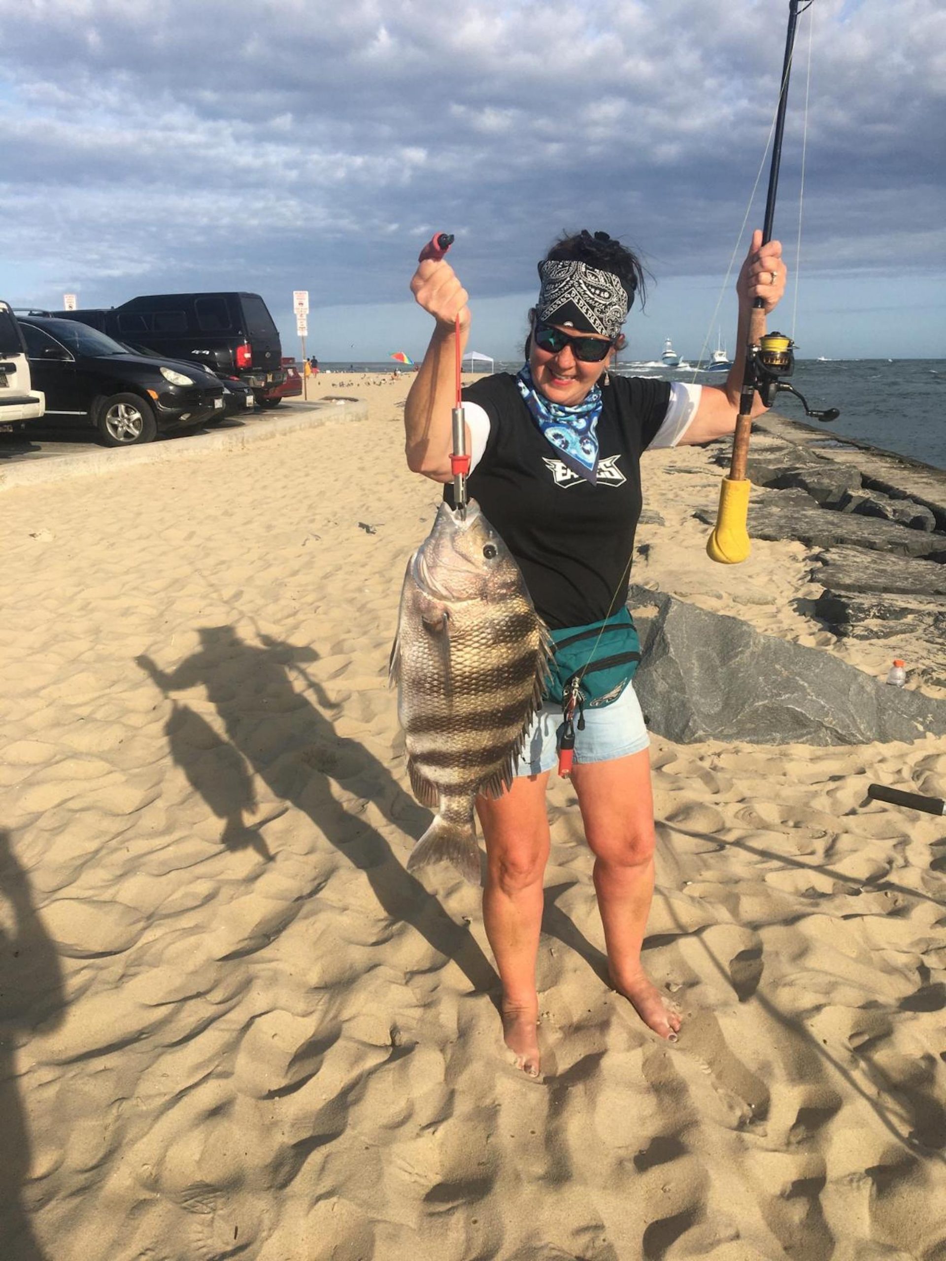 Chrissie the “Sheepshead Slayer” was at it again today and put this 24″ fish in the cooler while fishing the north sea wall on the OC inlet.