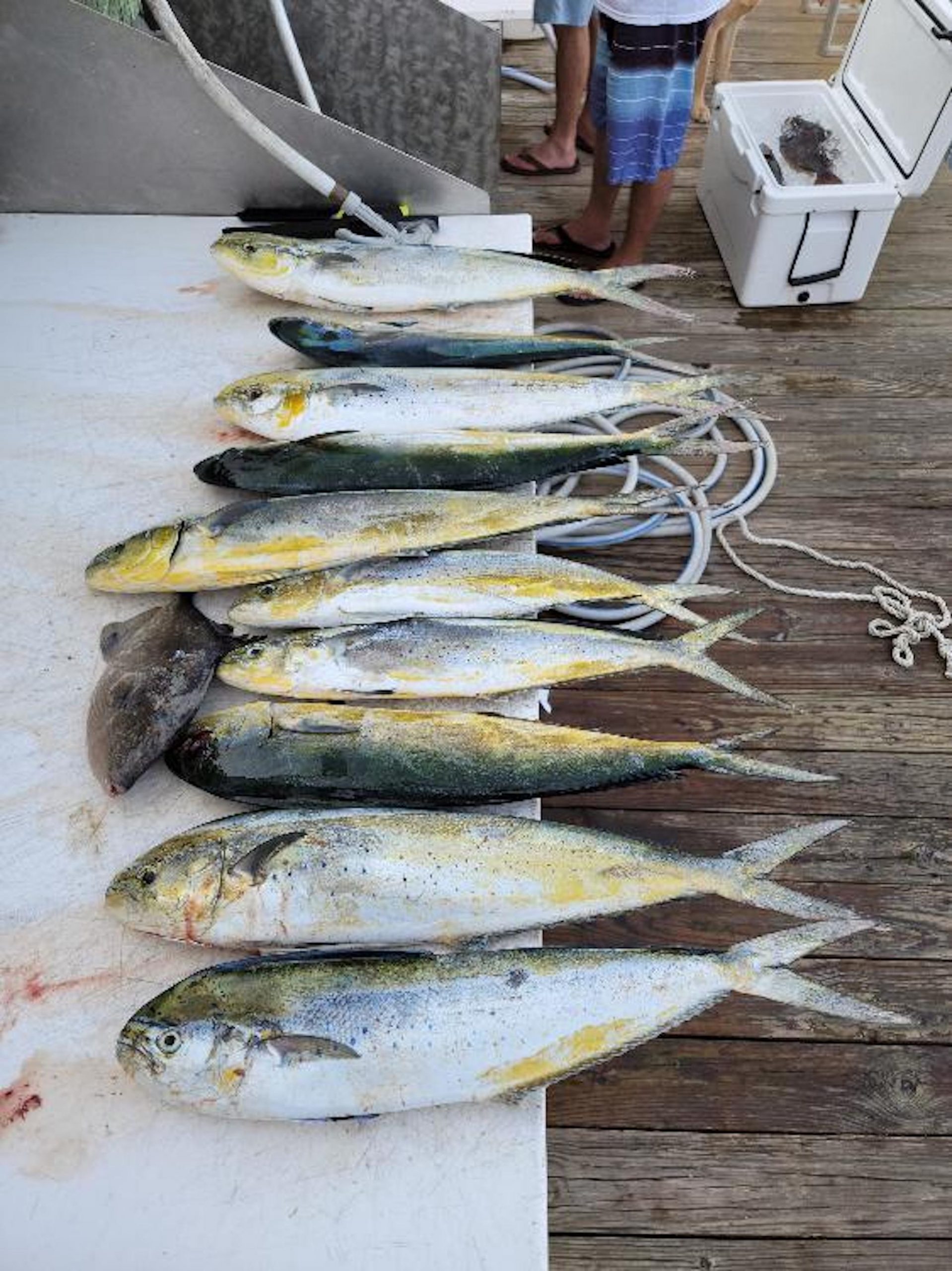 Sent em all home with dinner. Some a fine catch. Finished the day with our biggest mahi in 3 weeks. Took three anglers to bring it in on a 20lb spinning rod.