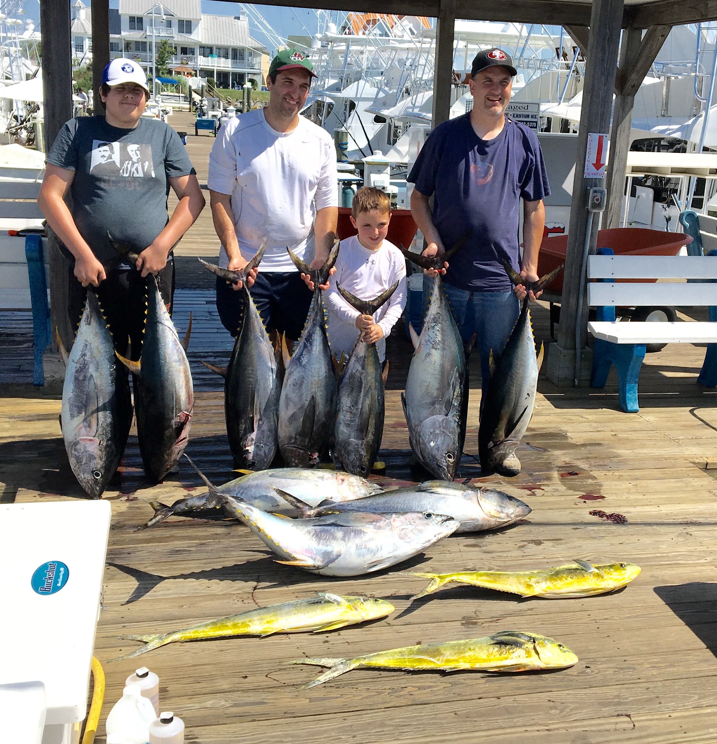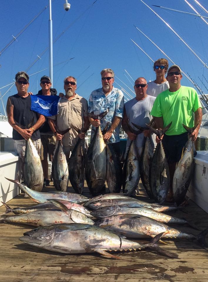 Captain Luke Blume on C Boys out of Sunset Marina with mate Jon Henry had an incredible trip today. Captain Luke had owner Paul Crampton and his friends from Hagerstown, MD on board today and he really put them on the fish. C Boys ended the day with 18 yellowfin tuna, one over 47″ bluefin tuna, a nice mahi and released another bluefin tuna. Captain Luke says today was, “the best chunking I’ve seen in a long time”.