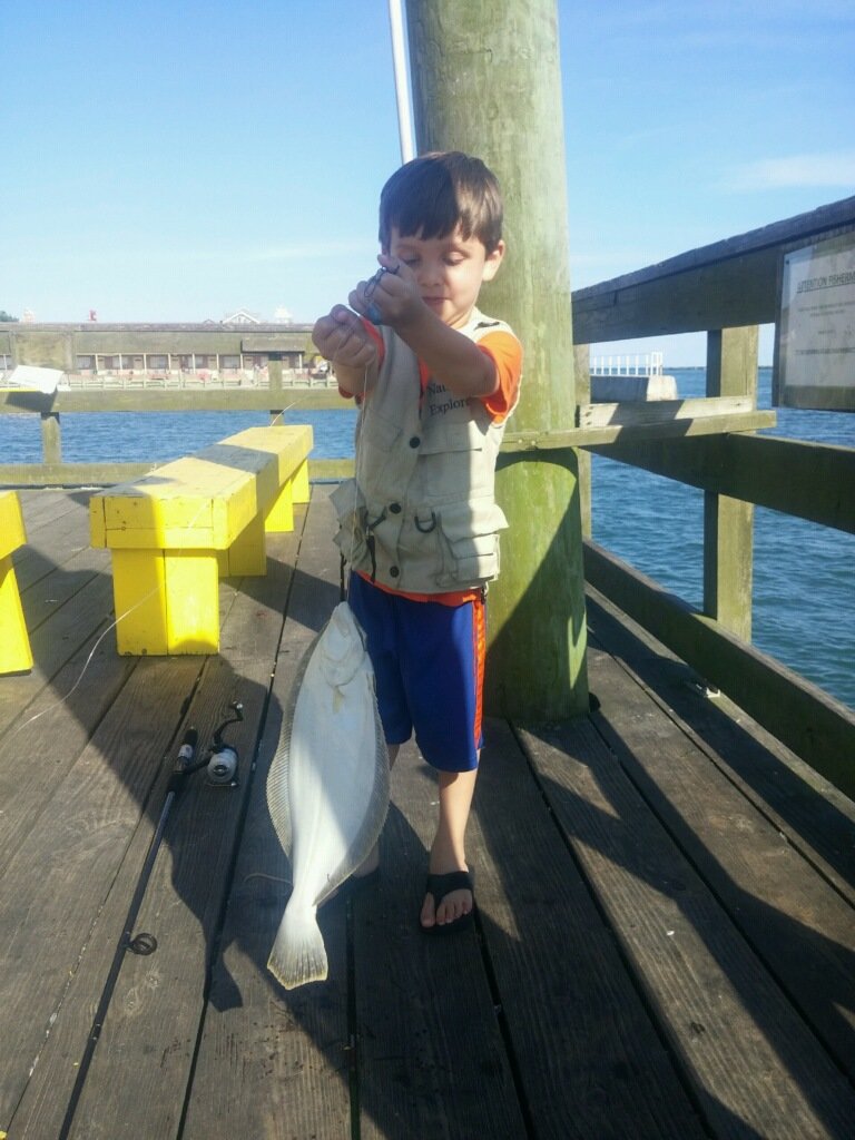 Bear from the Oceanic Pier sent in a great photo of 5-year-old Aiden who caught this nice keeper flounder from the pier this morning on their HUGE minnows.