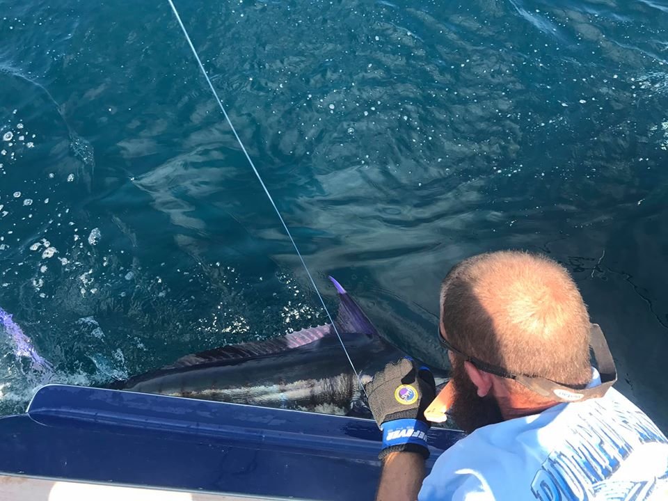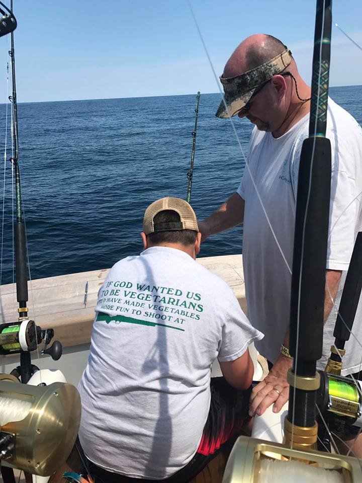 David and Michael Burt of Pumpin’ Hard had a good day of offshore fishing today because they had kids on board, and it quickly became a great day of offshore fishing when they put 10 year old Alden Pugh on his very first blue marlin. The crew also added a white marlin release and a fat yellowfin tuna to the tally for an exceptional day in the canyon.