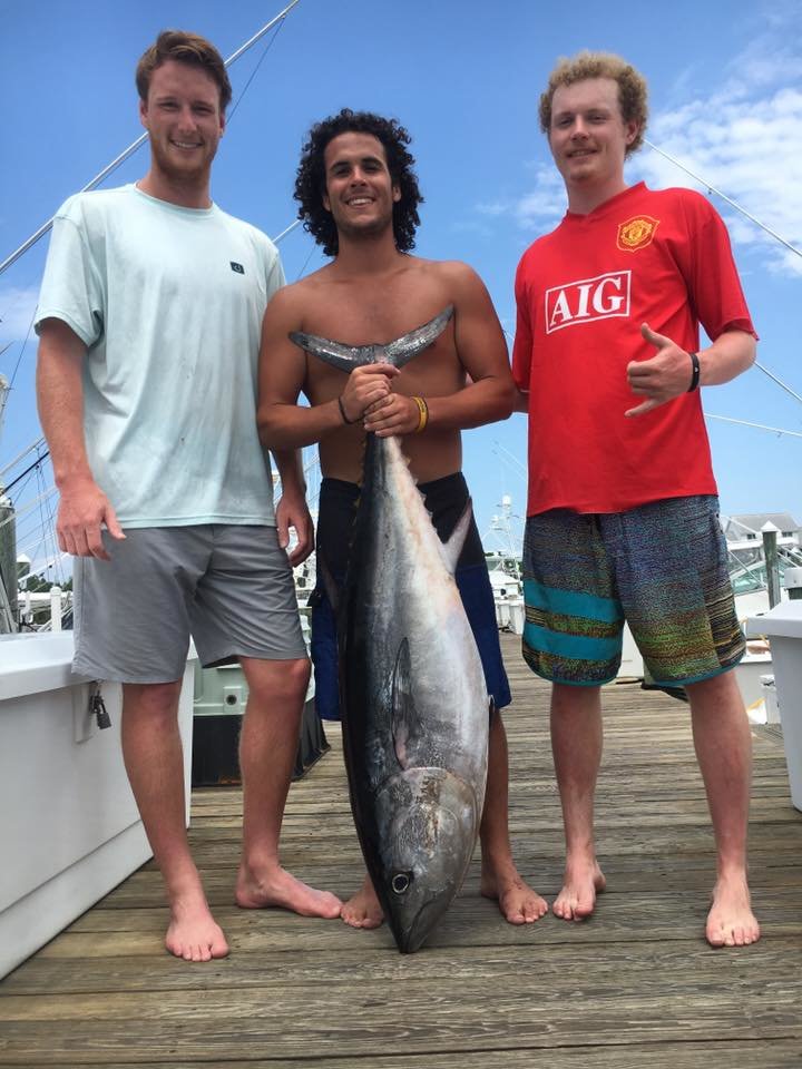 The Marli with Captain Mark Hoos and mate Mark Stephens can somehow get fish to bite when it’s darn near impossible. Captain Mark and mate Mark put the three young men in the below photo on their first tunas ever. The big yellowfins were caught chunking in Massey’s Canyon.