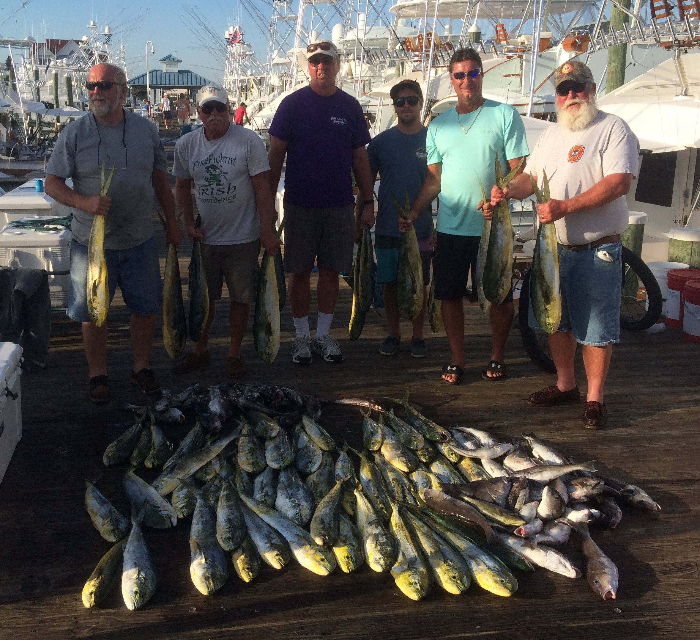 This group of Pennsylvania anglers had a fantastic day on the charter boat MARLI with Captain Mark Hoos and Mate Mark Stephens. They landed a limit of Mahi Mahi (60), 2 yellowfin Tunas (82 & 86 lbs) and released 2 White Marlin. All fish were caught on ballyhoos trolling in Poormans Canyon.