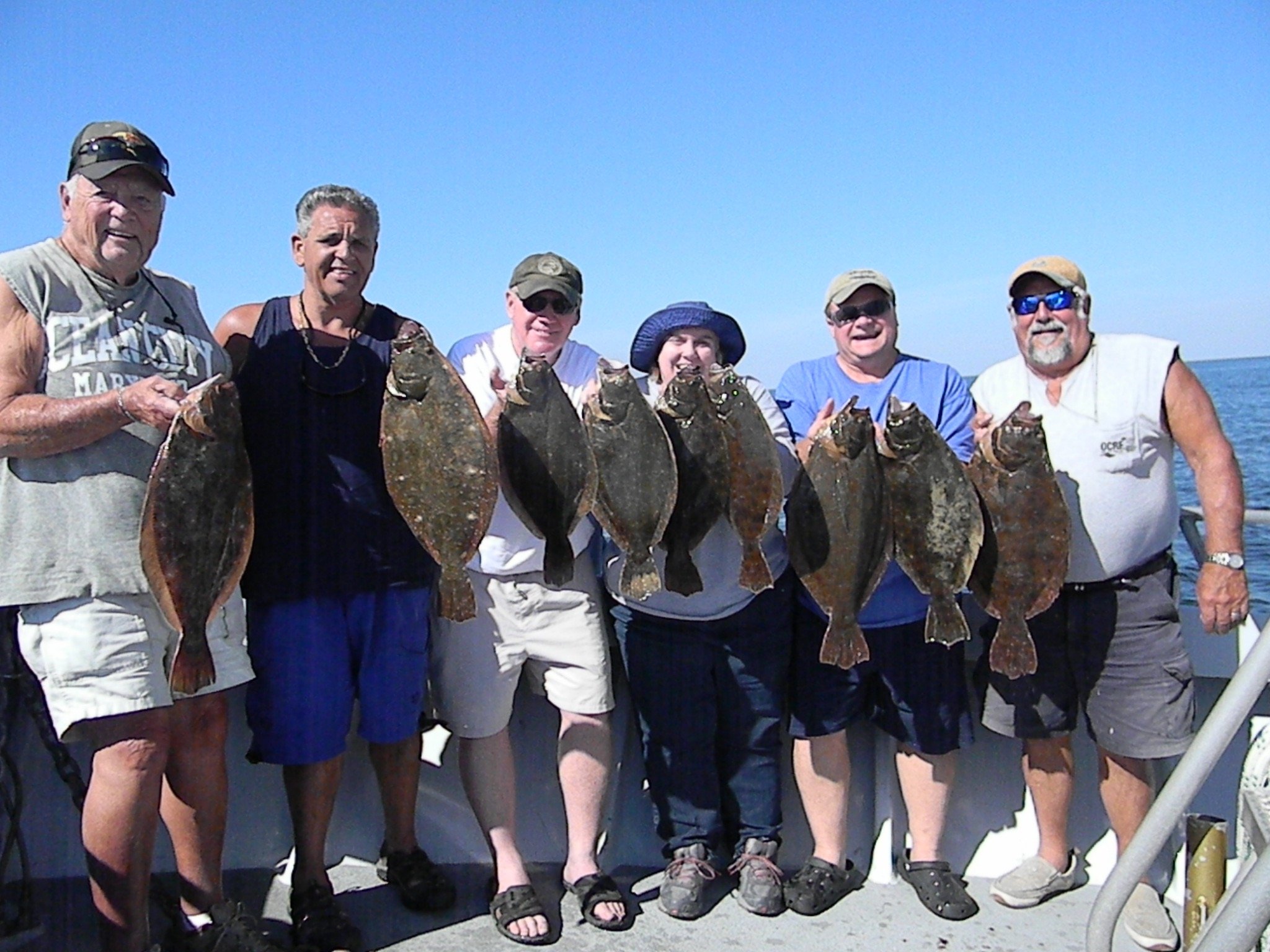 Captain Monty Hawkins on the party boat Morning Star out of The Ocean City Fishing Center had some anglers with big flounder today. L to R – Henry Sandlas OC, MD — Phil Micholson, Airmont, NY — Dutch “Tog Slayer” Workman, Salisbury, MD — Cathy Creel, OC, MD — Hurricane Murray Adams, Ellicott City, MD — & Mike Zigler of York, PA….