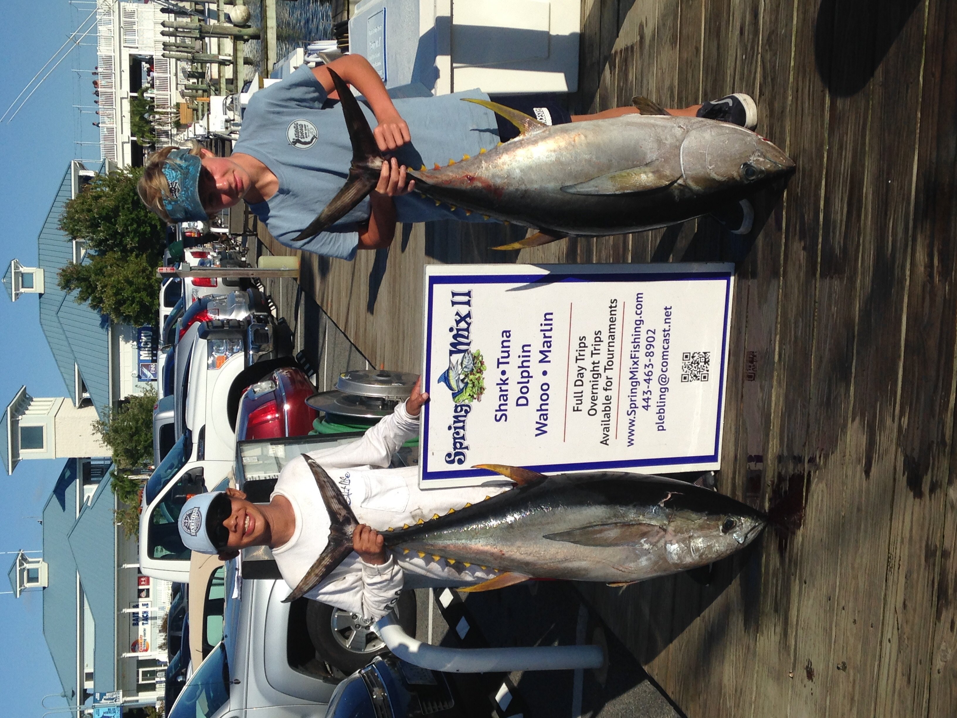 Captain Steve Selander and mate Chris Watkowski put anglers Ayrton Pryor and Jacob Lewis on two real nice yellowfins while chunking the Washington Canyon today. The two fish weighed 68 and 70 pounds.