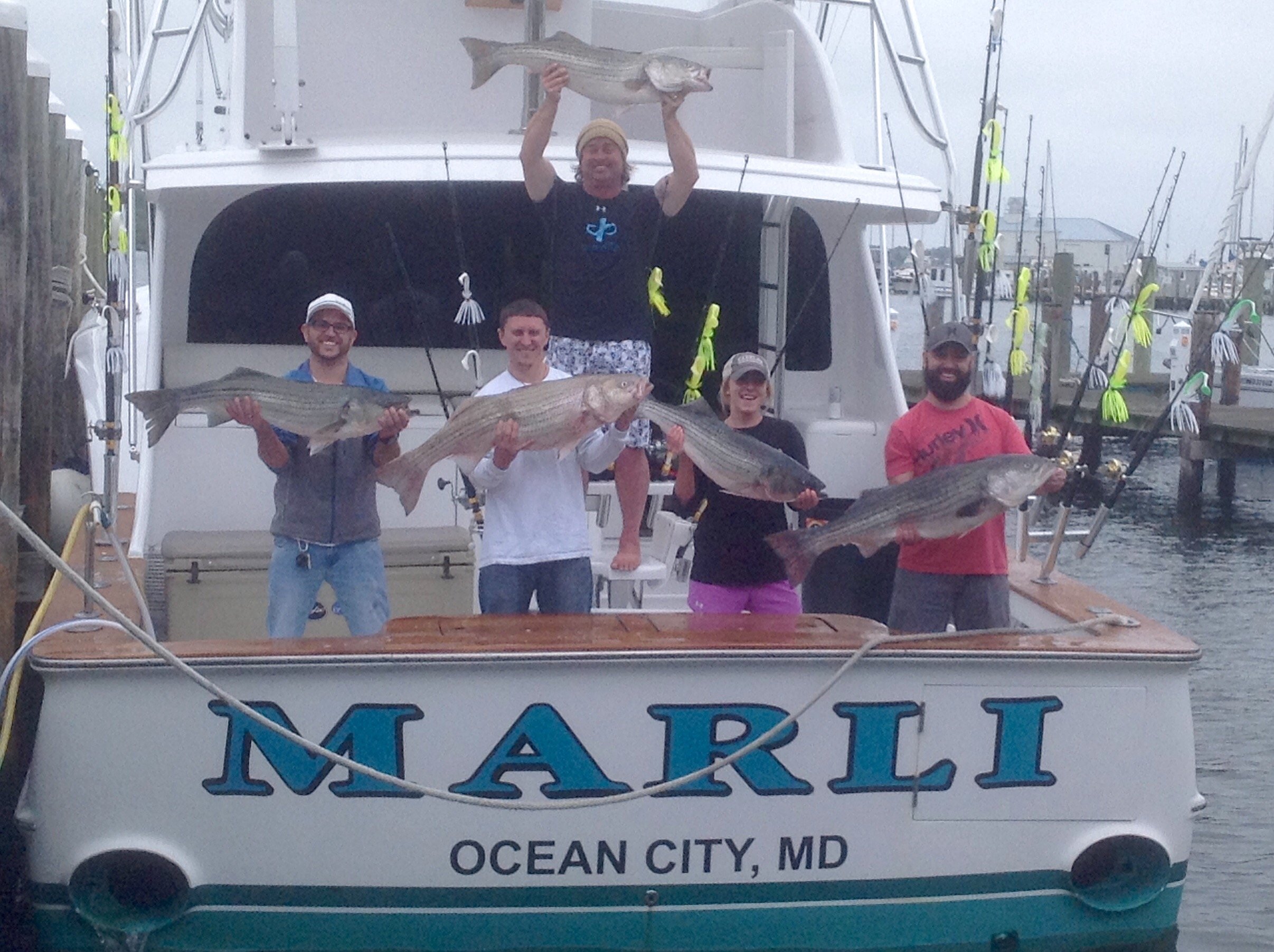 The Marli with Captain Mark Hoos and mate Mark Stephens is a Fish in OC partner that travels during the offseason. Captain Mark keeps the Marli in Solomons, MD for the spring trophy rockfish season during the months of April and May and is a rockfish catching machine. Today, Adam Pattisall and his crew braved the elements and caught their limit of nice rockfish and released a few others on the Marli out of Solomons. The fish were all caught in the mouth of the Patuxent River on tandem parachute rigs.