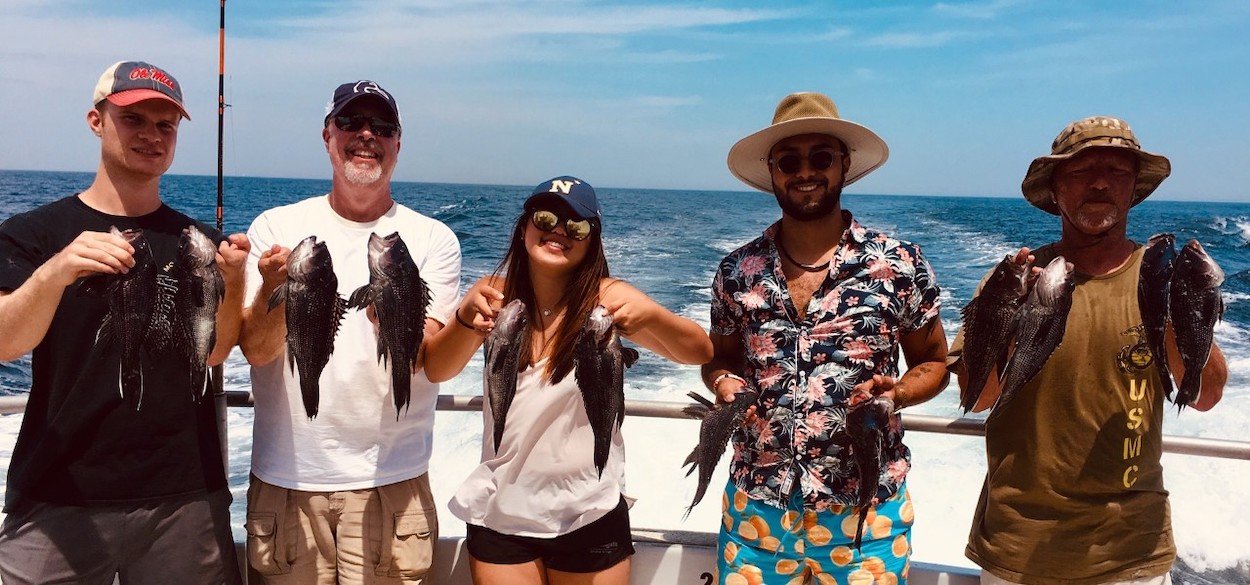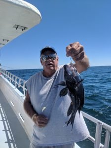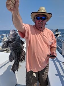 Our luck turned before lunch when a few pretty cbass crossed the rail. They continued to bite the rest of the day. A light, fussy bite; but good enough to get the job done, especially by staying an hour late — Dinner Baby!