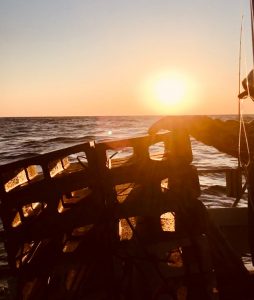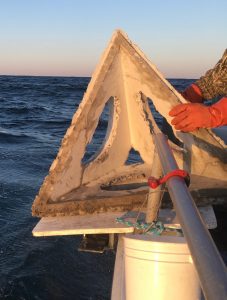Snuck out dark-thirty this AM – dropped 30 blocks & 2 pyramids at a distant artificial reef site at sunup and turned my bow into 20 knots of WNW wind. Was supposed to be less than 10 at that point.